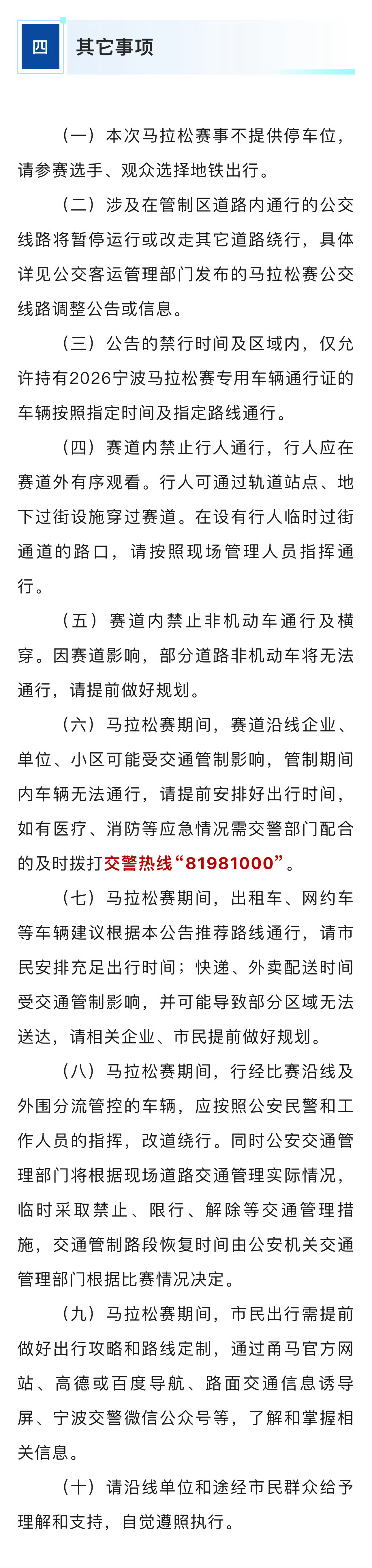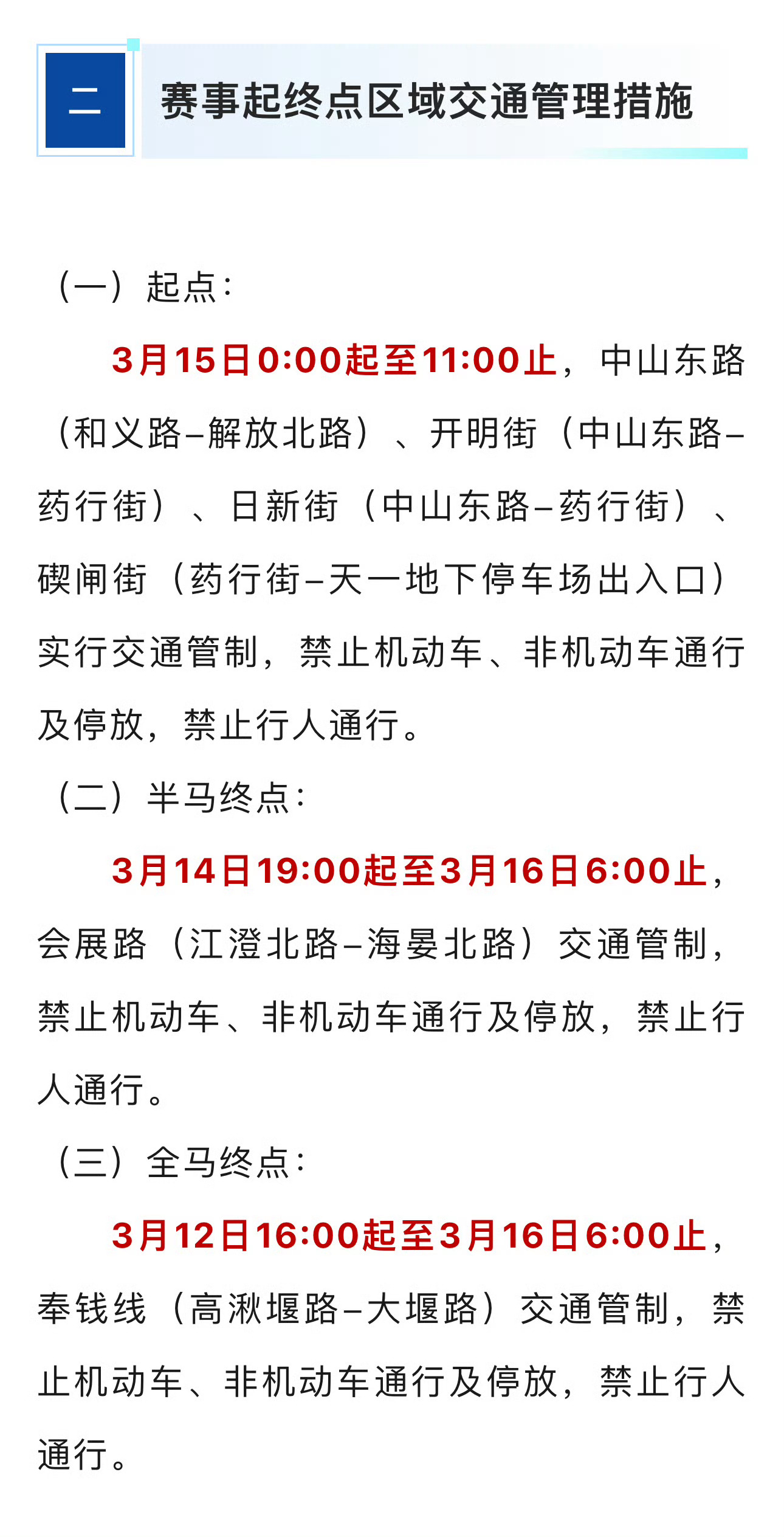 看看2026宁波马拉松交通管制对你有影响吗 315宁波马拉松🏃♀️交通管制⚠️对你有影响吗2026宁波马拉松将于3月15日(周日)7:00开跑🏃🏃赛事期间宁波部分道路将实施交通管制⚠️快来看看对你有没有影响👀📍三大重要点位👀图4⃣️🔛起点:中山东路阳光广场3月15日 0:00-11:00中山东路(和义路-解放北路段)开明街(中山东路-药行街)日新街(中山东路-药行街)碶闸街(药行街-天一地下停车场出入口)⚠️禁止机动车、非机动车通行及停放,禁止行人通行🚷🔚半马终点:会展路国际会展中心3月14日19:00-3月16日6:00会展路(江澄北路-海晏北路段)⚠️交通管制🚷禁止机动车、非机动车通行及停放,禁止行人通行🔚全马终点:奉钱线国际会议中心3月12日16:00-3月16日6:00(今天起‼️)奉钱线(高湫堰路-大堰路段)⚠️交通管制🚷禁止机动车、非机动车通行及停放,禁止行人通行📍沿途路线👀图5⃣️6⃣️3月15日0:00起至当日比赛结束止沿途许多道路也将分时、分段实施交通管制⚠️这些点位和路线的交通管制对你有影响吗🤔️周末你准备去马拉松凑热闹吗?
