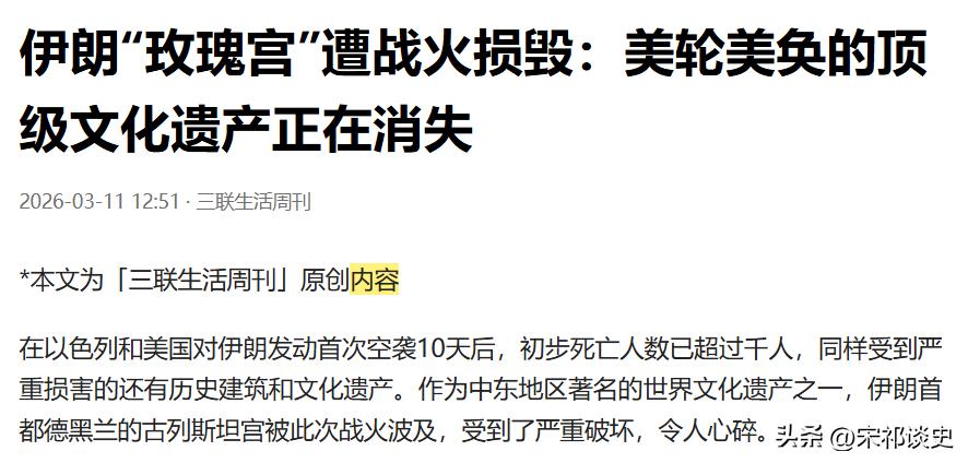 美以空袭重创伊朗玫瑰宫,世界文化遗产为何总在战火中凋零? 从三联生活周刊的文章中了解到,美以联军对伊朗发动空袭后,德黑兰的古列斯坦宫(玫瑰宫)遭受严重破坏。 这座中东著名的世界文化遗产,其彩色玻璃花窗、镜面镶嵌装饰尽数震碎,拱门与木门断裂,千年艺术瑰宝面临损毁危机。 古列斯坦宫始建于16世纪萨菲王朝,卡扎尔王朝时成为皇家宫殿。 1998年重新对公众开放,2013年被列入世界文化遗产。 可如今,这些承载着波斯文明记忆的建筑,在炮火中伤痕累累,刚修复完的钻石宫窗户破碎、天花开裂。 战火的伤害从未只停留在一方,伊朗回击时,特拉维夫拥有全球最大规模的包豪斯建筑群也遭损毁。 中东多地的文化遗产早已在冲突中屡遭劫难,巴尔米拉、阿勒颇等古城的悲剧还历历在目。 如今玫瑰宫与特拉维夫建筑群再遭重创,无疑是全人类文明的又一次重大损失。 联合国教科文组织强调文化财产受国际法保护,可战火之下,保护往往难以落地。