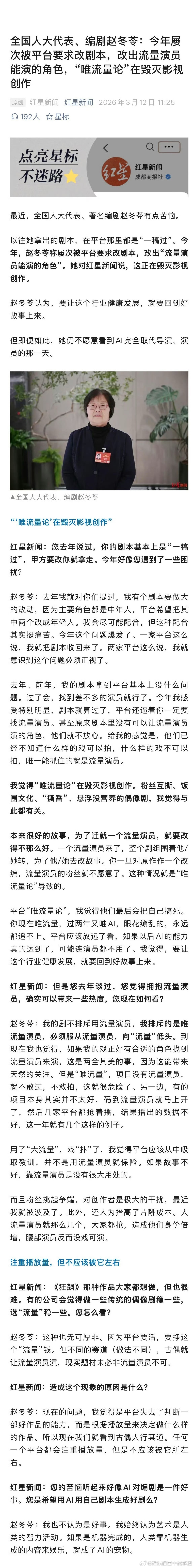 编剧赵冬苓受今年屡次被平台要求改剧本,甚至改出“流量演员能演的角色”,“我觉得‘唯流量论’在毁灭影视创作。