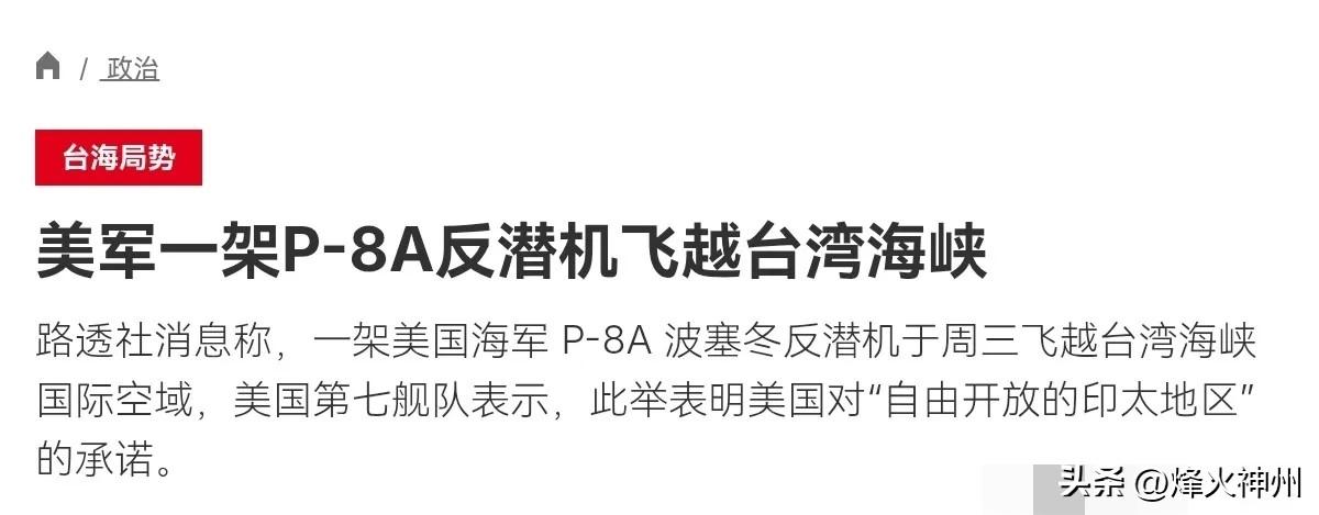 3月12日,根据法新社报道,法媒称,一架美国海军 P-8A 波塞冬反潜机于周三飞越台湾海峡,美国第七舰队对此表示称,美国按照国际法在台湾海峡行动,美国维护所有国家的航行权和自由。很显然,美国战机在台海飞行,明显是故意为之。 评几句: 3月12日法新社报道,美军P-8A反潜机公然飞越台湾海峡,第七舰队还打着“国际法”与“航行自由”的幌子粉饰挑衅。这绝非例行飞行,而是精心算计的政治操弄,虚伪至极、险恶至极。 美国嘴上喊着维护秩序,实则把台海当博弈棋盘,以军机耀武扬威,为“台独”势力撑腰打气,蓄意破坏地区和平稳定。所谓“符合国际法”,不过是霸权主义的遮羞布,台湾海峡的主权与管辖权属于中国,美方行径粗暴干涉中国内政,严重践踏国际关系基本准则。 解放军全程跟监警戒、依法处置,就是对美方最直接的回击。中国捍卫国家主权和领土完整的决心坚如磐石,任何在台海玩火、挑衅底线的行为,都必将遭到坚决反制,最终只会搬起石头砸自己的脚。