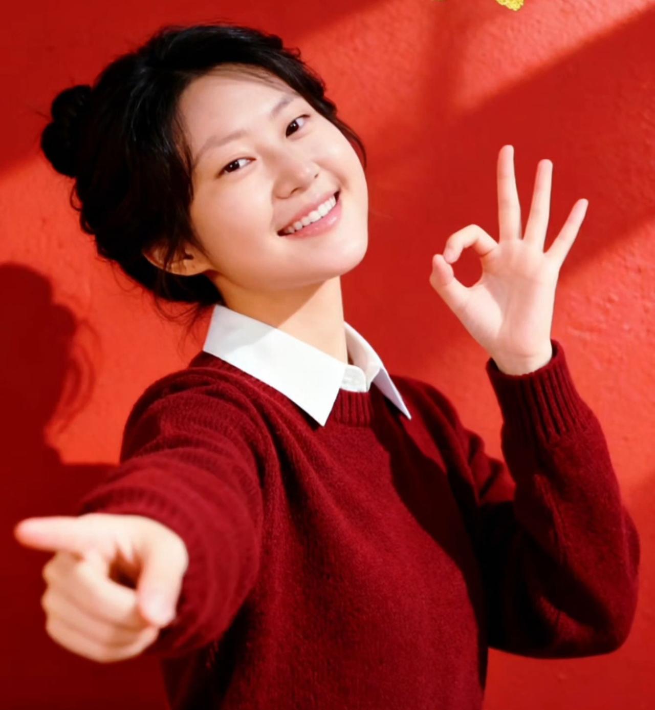 女生对着镜头比出“OK”手势,面带微笑。