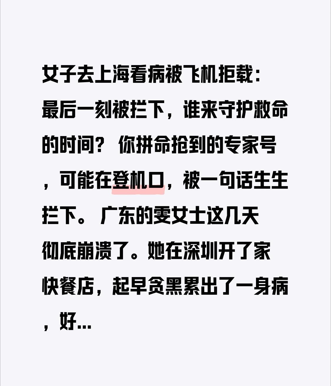 女子去上海看病被飞机拒载:最后一刻被拦下,谁来守护救命的时间? 你拼命抢到的专家号,可能在登机口,被一句话生生拦下。 广东的雯女士这几天彻底崩溃了。她在深圳开了家快餐店,起早贪黑累出了一身病,好不容易抢了半个月,才约到上海三甲医院初八上午的专家号。为了不误诊,她花2000多买了早班机,凌晨就守在机场,值机、托运一路顺利,眼看就要踏上廊桥,却被地勤一把拦住:航班超售,你不能上。 那一刻,身后晚到的人都上了飞机,只有她被挡在舱门口。她哭着求:我是去救命的,专家号过时不候!工作人员只反复说:抱歉,给你改签12点的,再补400块,还能升公务舱。 400块。这是她花3万找黄牛买的专家号作废的零头,是她几个月熬出来的辛苦钱,却成了航司对她救命时间的“补偿”。 本来以为这只是一场倒霉的超售,没想到转折彻底撕开了现实的残酷。 雯女士把经历发上网,全网炸了。有人晒出自己的就医经历:我也因为航班延误,错过手术,差点没命。有人怒问:超售不是应该优先征集自愿改签吗?为什么把赶去看病的人拦下? 更有人质疑:规则是死的,人命是活的,航司机械执行,算不算失职? 更让人揪心的是,她为了这趟看病,花3万买黄牛号,机票、住宿全砸了进去,却被一句“不赔黄牛票”挡在门外。对她来说,这不是钱的事,是被航班掐断的生的希望。 说到底,我们缺的从来不是规则,而是规则之外的人性温度。 航班超售是商业行为,但面对一个明确赴诊、刻不容缓的特殊旅客,是否有更高优先级的处置方案?是否能协调机位、安排陪护,而不是一句冷冰冰的“抱歉”? 我们都有生病的可能,都需要奔赴医院。当救命的通道被堵住,当规则成了冷漠的挡箭牌,谁来守护我们对生的期盼? 今天,依然有人在奔赴医院的路上受阻。愿每一份对生命的渴望,都能被温柔以待;愿规则之上,永远有对生命的敬畏。 你遇到过就医受阻的情况吗?评论区说说你的看法,为雯女士也为每一个努力求生的人点个赞。