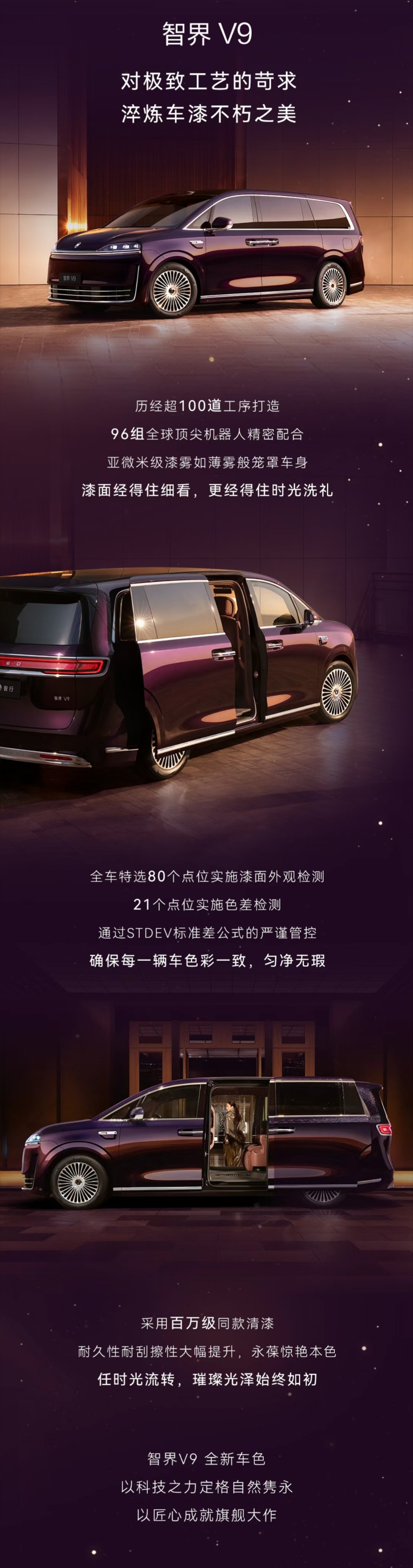 余承东曝光智界V9新色 四款车色历经超百道精密工序与突破性纳米研磨工艺打磨,最终呈现出细腻通透的漆面质感。我个人更喜欢黑色和紫色大家怎么选?