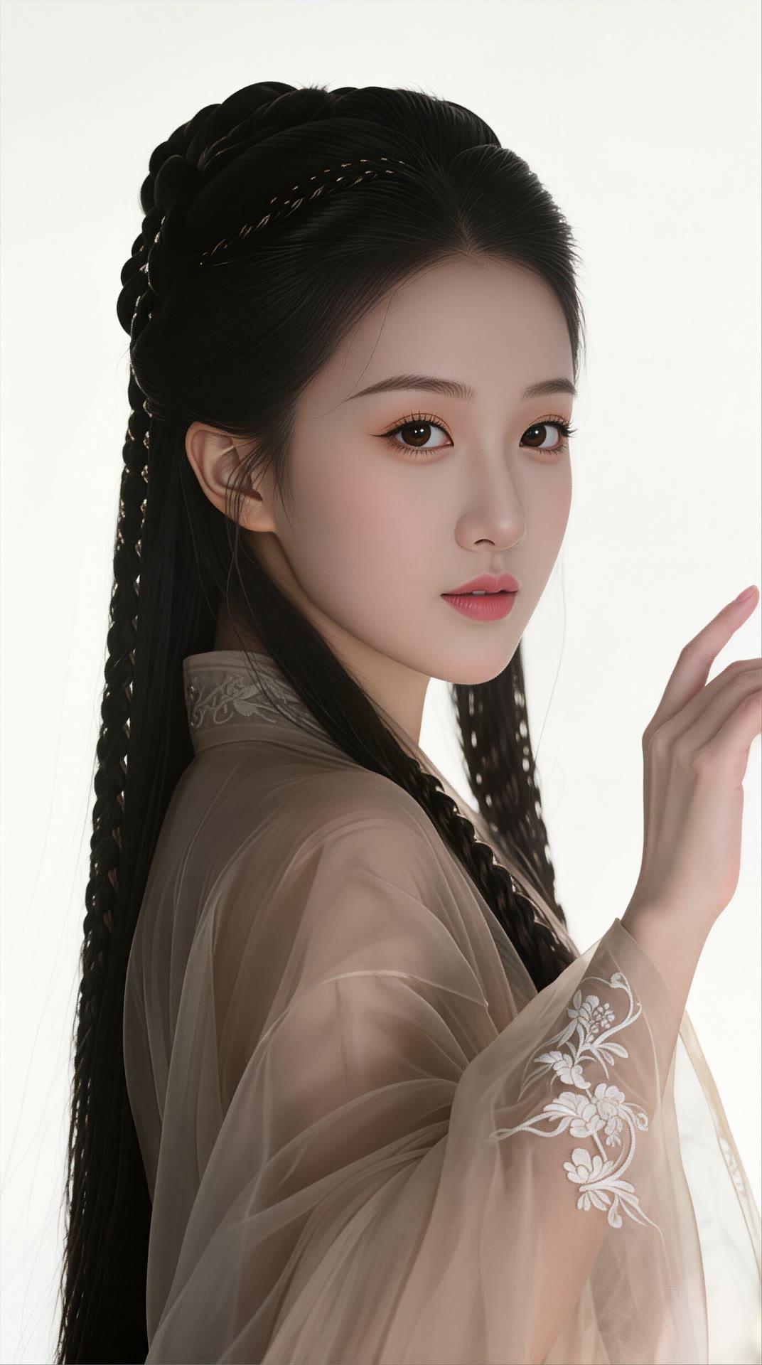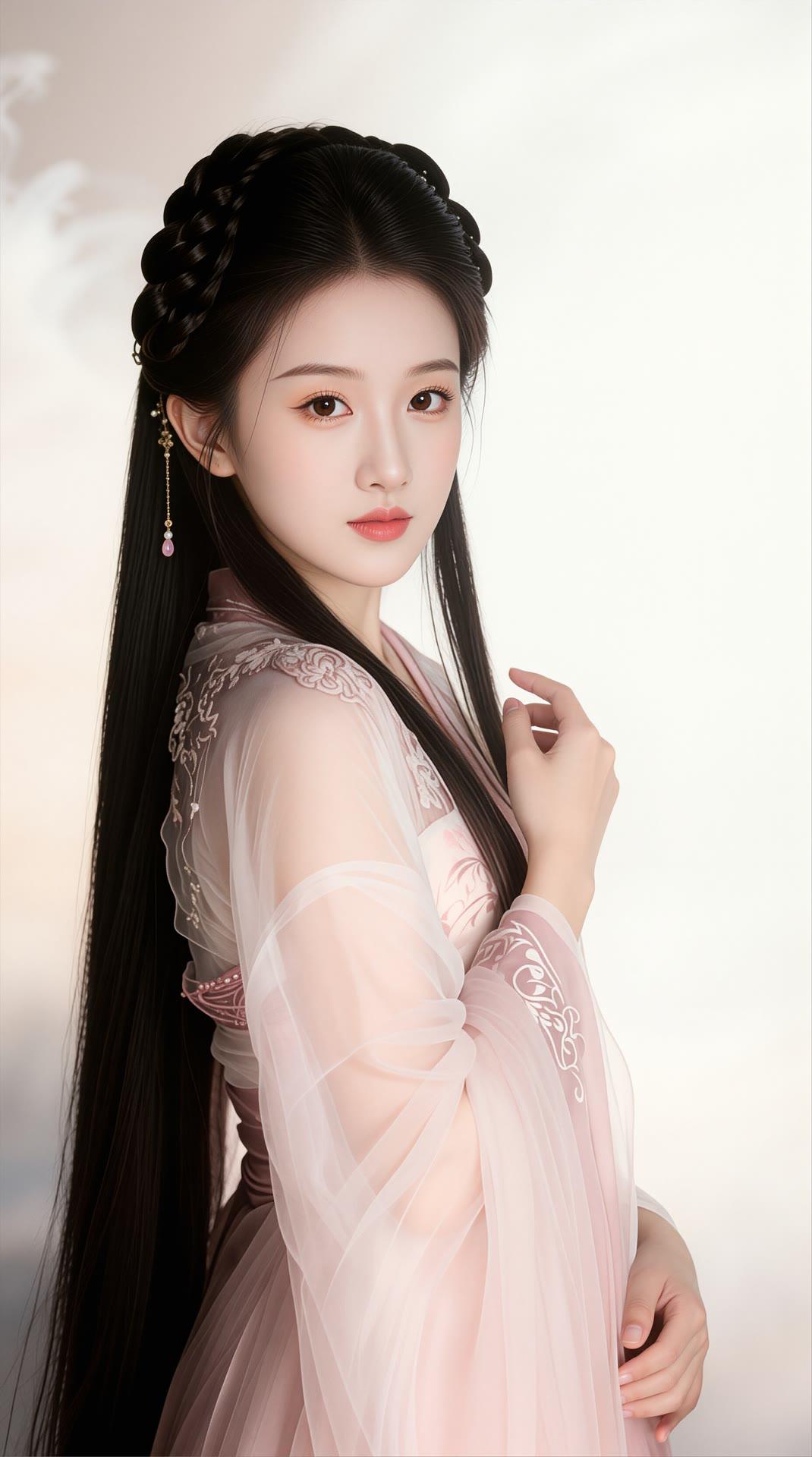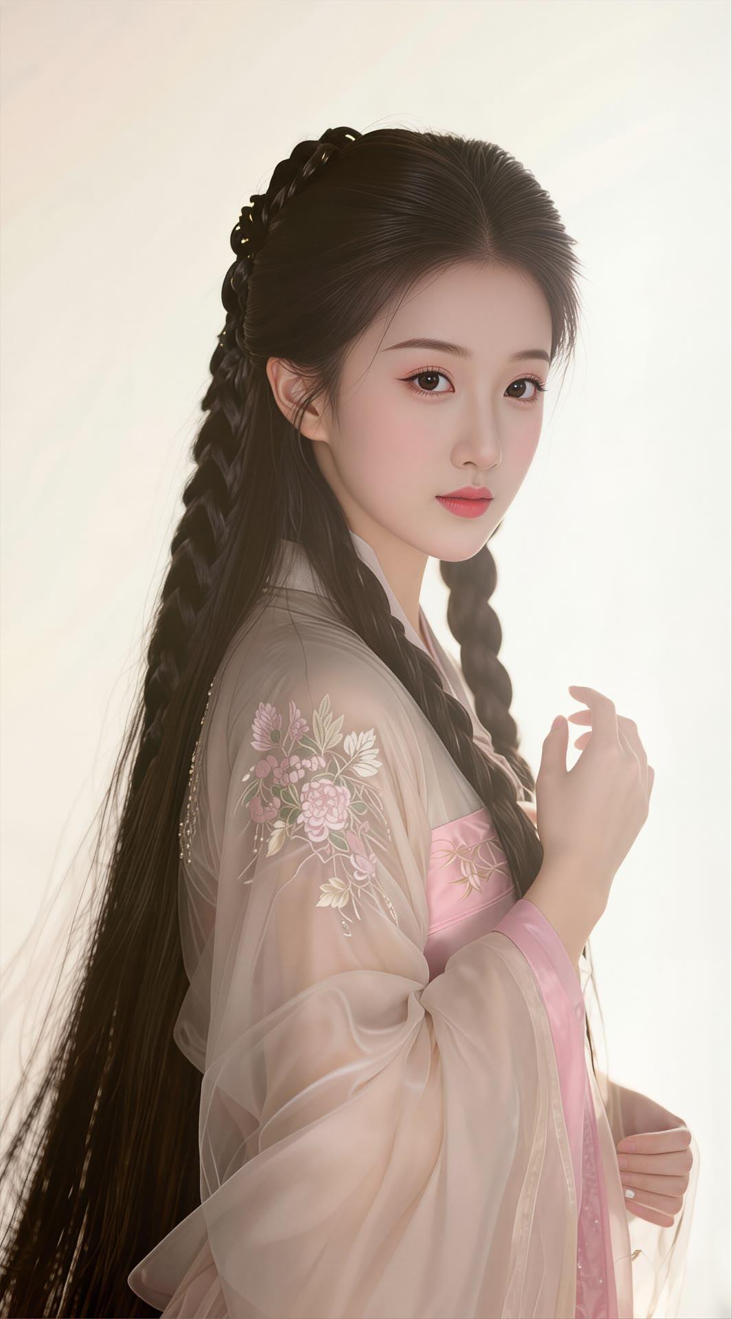 温柔古风少女,粉色花枝刺绣,长发编辫,古典优雅。