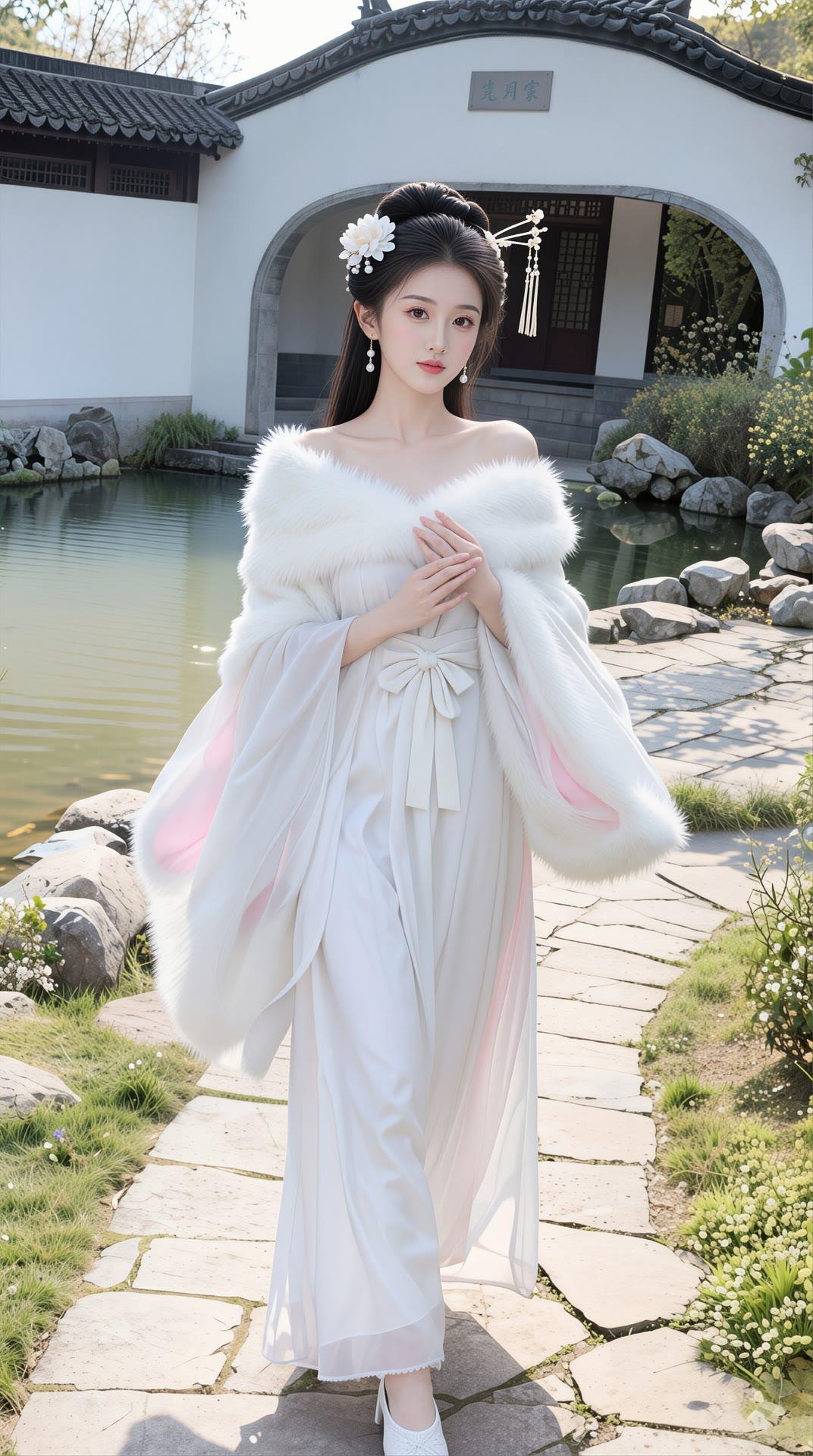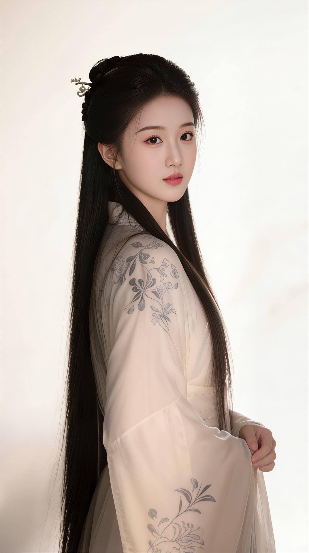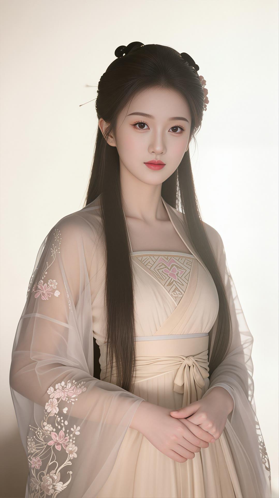 温柔古风少女,粉色花枝刺绣,长发编辫,古典优雅。