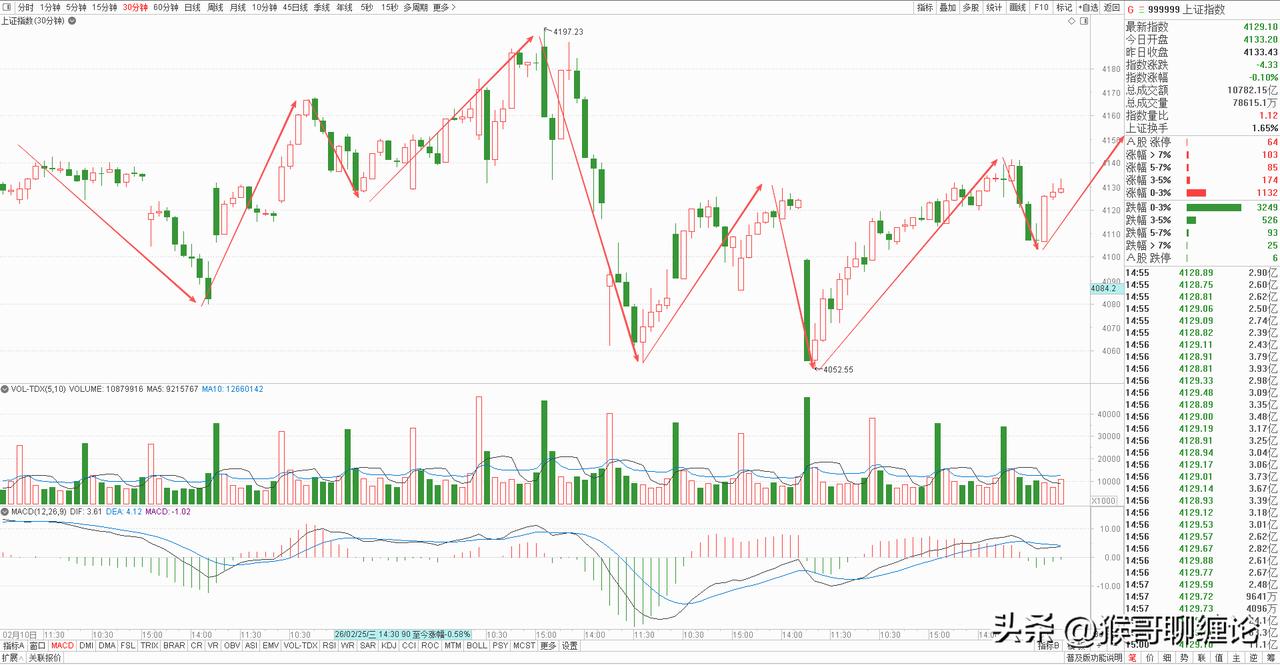 大盘今天小幅高开后快速回落,随后在4120-4135点区间窄幅震荡,午后波动幅度进一步收窄,尾盘略有回落,整体呈现“缩量震荡、重心平稳”格局。4100点关口支撑显著,多次下探均未能有效跌破,显示多头防守意愿较强;但上方4140点附近压力也比较突出,多次冲高受阻,还是一个弱平衡的局面。 从结构上看,今天收盘位于5日均线附近,日线级别多头格局未被打破,但均线发散节奏放缓,短期上涨动能有所减弱。从技术指标看,MACD指标红柱缩窄,KDJ指标高位拐头向下,显示短期存在调整需求,但整体趋势未发生根本性逆转。