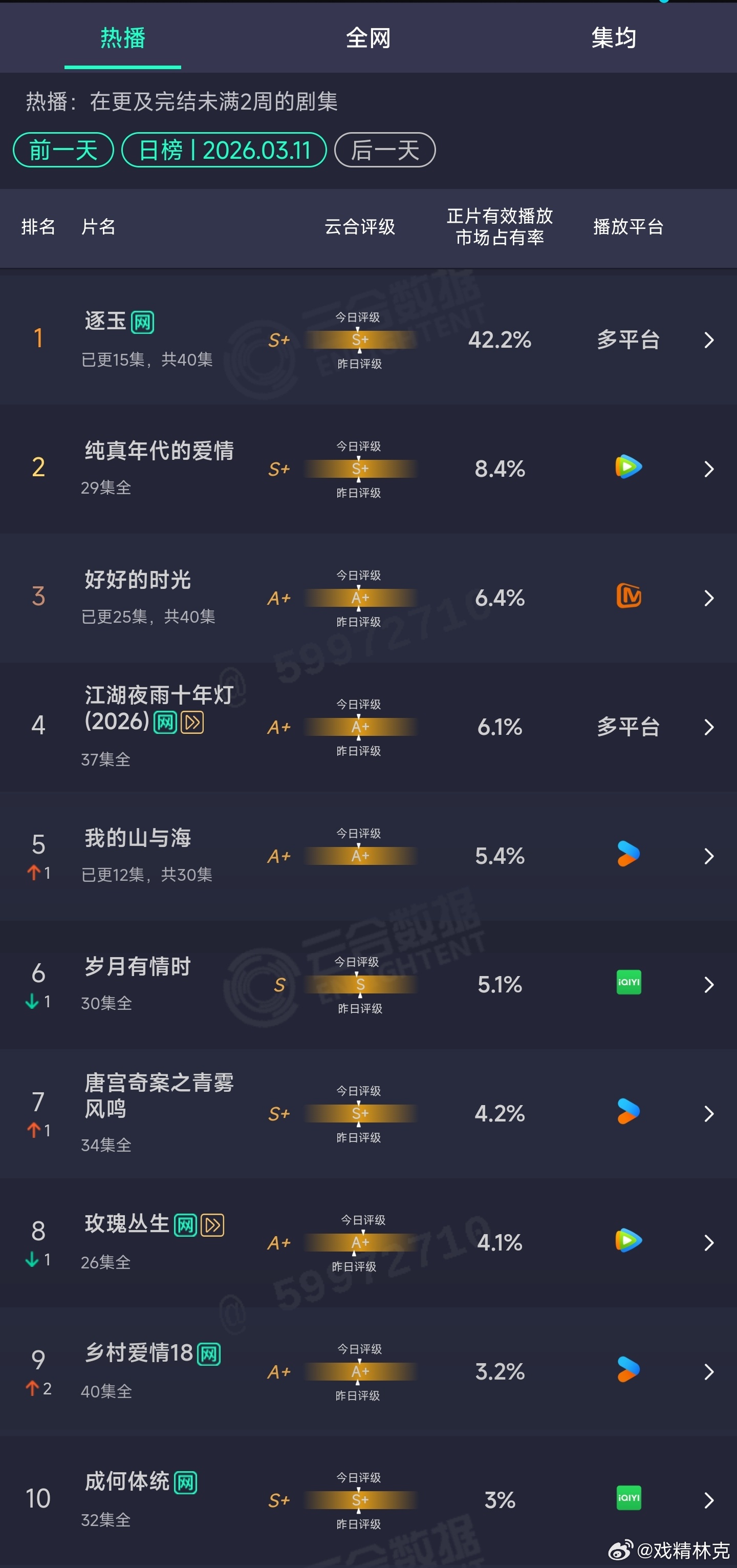3.11云合:逐玉🐧🥝双破万日42.2%