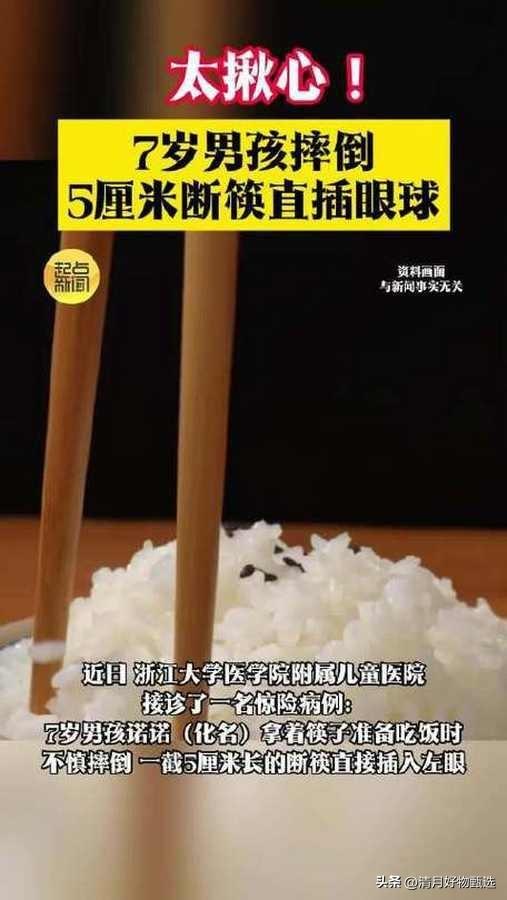 近日,浙江一名7岁男童手持筷子准备就餐时意外摔倒,一截约5厘米长的断裂筷头刺入左侧眼眶。 感谢你提供的具体案例信息。 医生针对浙江这名7岁男童手持筷子摔倒,断裂筷头刺入左侧眼眶的意外,下面是更针对性的急救和预防建议: 事件:7岁男童用餐时不慎摔倒,断裂的筷头约5厘米长刺入左侧眼眶。 伤情严重:异物深度较大,涉及眼眶软组织甚至可能威胁眼球及视神经安全。 急救处理建议 切勿自行拔出异物 异物刺入眼眶后,切勿尝试拔出,以免加重出血、感染或造成更严重的眼部及脑部损伤。 固定异物并防止晃动 使用干净的纱布或布料轻轻包裹异物周围,避免异物移动,同时减少对眼部的压力。 避免压迫眼球和眼眶 不能用力按压眼睛或周围组织,防止眼内压升高及组织进一步损伤。 保持患儿头部稳定 轻轻扶稳患儿头部,避免剧烈晃动。 尽快送医 立即联系急救车或迅速送往具备眼科和神经外科能力的综合医院进行专业救治。 防止感染 医院会根据情况给予抗生素预防感染,家长切勿自行用药。 医疗救治重点 影像学检查 通过CT或MRI检查异物位置及是否损伤眼球、视神经或颅内结构。 手术处理 由眼科及相关专科医生联合制定手术方案,安全取出异物,修复受损组织。 术后观察与康复 关注视力恢复、感染控制及眼部功能恢复。 预防建议 用餐安全教育 教育儿童用餐时不要奔跑、嬉戏,避免手持尖锐物品时发生跌倒。 家庭环境安全管理 餐具摆放合理,避免儿童在用餐区域玩耍。 监护人注意力集中 特别是学龄前及低年级儿童用餐时,家长应保持看护。 急救知识普及 家长和教师应掌握儿童眼外伤的急救常识,提高应对能力。 这起筷子断裂刺入眼眶的事件提醒我们,儿童日常生活中存在不少潜在危险,尤其是尖锐物品的使用和管理需格外谨慎。遇到类似眼外伤时,及时、科学的急救和专业医疗干预是保护孩子视力和生命安全的关键。家长应加强安全教育和防护意识,减少意外发生。