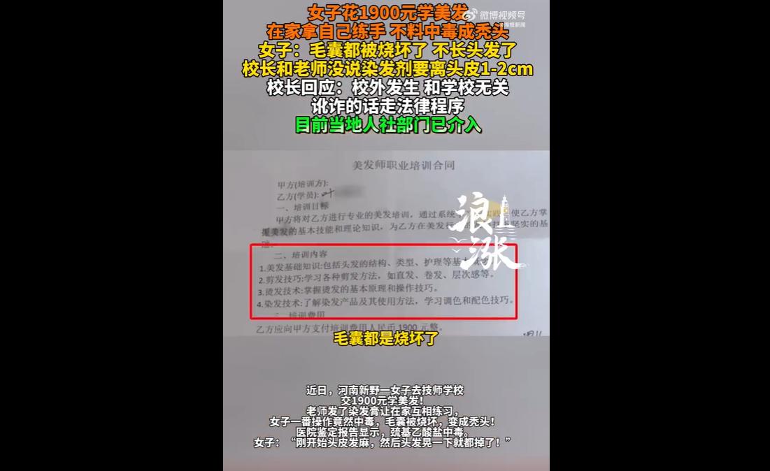 河南南阳一女子交1900元在技师学校学美发,老师发放染发膏让学员在家互相练习,女子拿自己头发练手后中毒,毛囊被烧坏变成秃头。 女子称校方未告知染发剂需远离头皮,校长却称此事在校外发生与学校无关,还指责女子讹诈,目前当地人社部门已介入。 交1900元学美发,没学到半点手艺,反倒把自己“毒”成秃头,毛囊坏死永不再生,这不是学艺,是花钱买毁容! 更令人愤怒的是,面对学员的悲剧,校长不仅毫无愧疚,反而甩锅狡辩、倒打一耙,这份冷漠与无赖,刷新了做人的底线,也暴露了这所技师学校的敷衍与失职,令人发指。 最令人唾弃的,是校方的失职与毫无担当。 女子交了学费,学校就有义务提供专业的教学指导和安全保障,可这所学校,只收钱不负责:发放的染发膏大概率是劣质有毒产品,老师未提前告知操作禁忌,未提醒染发剂需远离头皮1-2cm,甚至让学员在家自行练习,完全放任学员的安全于不顾。 说白了,这根本不是正规的教学,而是打着“学美发”的幌子,收割学员的血汗钱,漠视学员的人身安全。 更讽刺的是校长的无耻甩锅。 学员因学校发放的染发膏、未传授的安全知识而中毒秃头,这本是学校的全责,可校长却轻飘飘一句“校外发生和学校无关”,甚至恶语相向,指责女子讹诈,妄图用“走法律程序”的狠话掩盖自己的失职。 这种避重就轻、倒打一耙的嘴脸,比女子秃头的悲剧更令人心寒——收着学员的学费,却不履行教学和安全保障义务,出了问题就甩锅,这样的学校,根本不配教书育人,更不配存在于教育行业。 1900元,换来了终身秃头的悲剧;一句甩锅,暴露了校方的无耻与冷漠。 这起事件给所有想学手艺的人敲响了警钟:选择培训机构,一定要擦亮双眼,远离那些只收钱不负责的黑心机构。 更提醒所有培训机构,教书育人、保障学员安全是底线,若一味贪婪、敷衍塞责、逃避责任,终将被行业淘汰,被法律严惩,更会被世人唾弃。