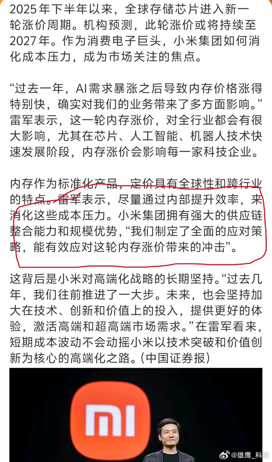 雷军称小米能有效应对内存涨价冲击 小米集团拥有着强大的供应链整合能力和规模优势。雷总表示,尽量通过内部提升效率,来消化这些成本压力。