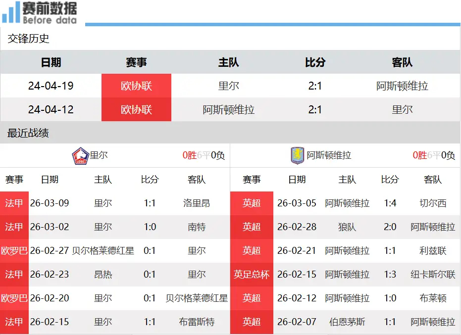里尔vs维拉前瞻:法甲劲旅坐镇主场 维拉状态堪忧北京时间3月13日凌晨01:45,欧联杯1/8决赛首回合,里尔主场迎战阿斯顿维拉。里尔对阵阿斯顿维拉,本场重点看点如下:第一:两队基本情况!里尔欧联阶段排名第18,附加赛击败贝尔格莱德红星晋级;阿斯顿维拉欧联阶段排名第二直接晋级。里尔目前法甲第六,身价2.36亿欧;维拉英超第四,身价5.48亿欧。上轮里尔主场1-1战平洛里昂,近期保持不败势头;维拉主场1-4大败切尔西,连续不胜状态低迷。第二:里尔防守稳健,主场更有底气!里尔近期防守质量很高,近5场仅丢2球,主场作战优势明显。里尔状态远好于维拉,英超球队多线作战体能透支,欧战表现集体低迷。客场低迷的维拉很难击穿里尔防线,本场看好里尔主场不败。双方近两次交手各胜一场,比分都是2-1,主场球队全部取胜。伤停方面:里尔凯拉德、萨罗伊、伊格曼、图雷、E.姆巴佩伤停;阿斯顿维拉麦金出战存疑,蒂勒曼斯、卡马拉、埃利奥特、加西亚缺阵。