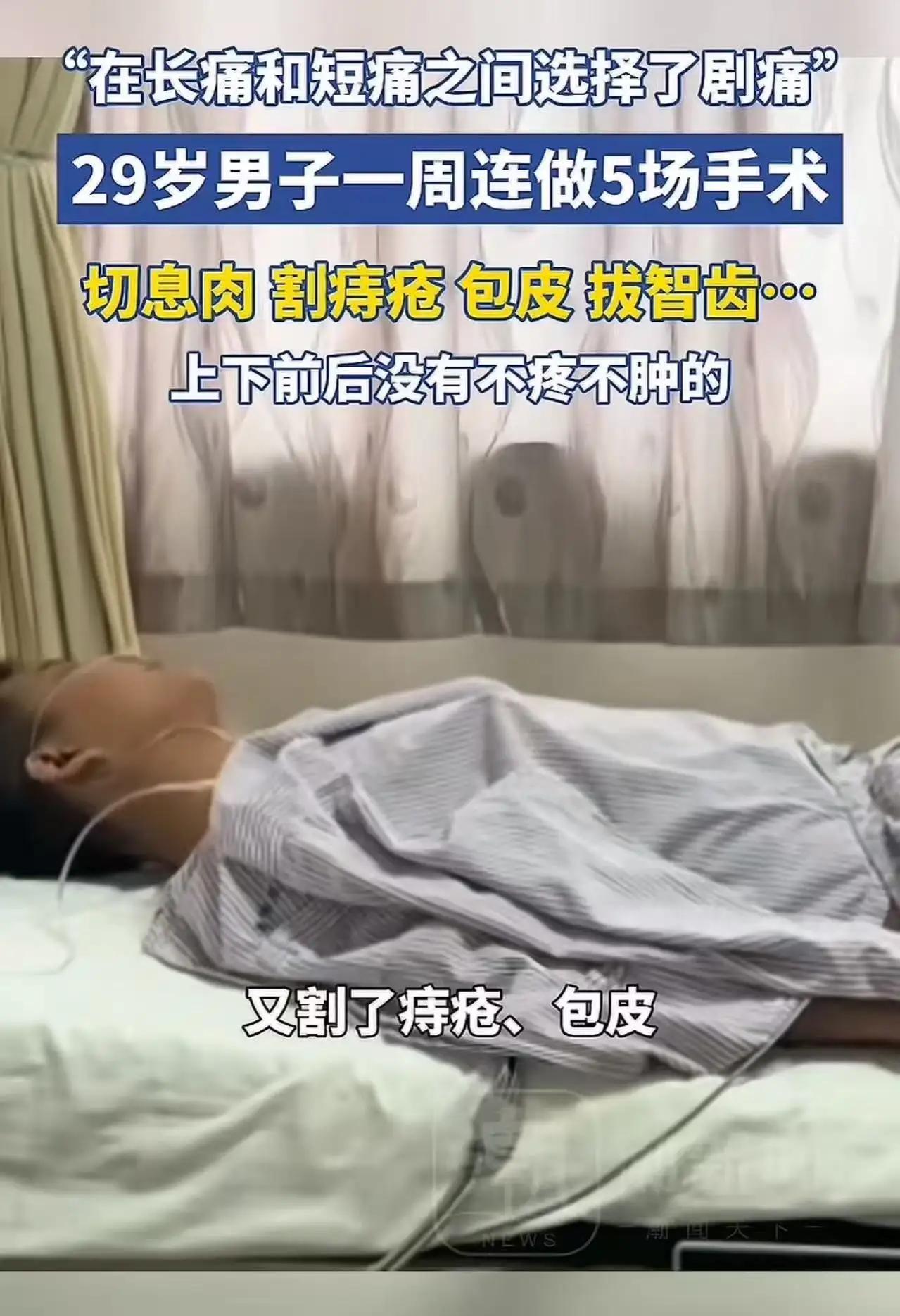 “真是个狠人!”辽宁icon,29岁男子一周连做5场手术,在先切除肠肌肉,又割了痔疮包皮,本想一次性治好,结果遭老罪了。男子:“上下前后没有不疼不肿的!”网友:“在长痛和短痛之间选择了剧痛!” 真是个狠人!辽宁29岁男子一周连做5场手术,网友:在长痛和短痛之间,他选了剧痛 辽宁沈阳,一位29岁男子凭一己之力刷爆全网,被网友封为“年度狠人”。别人看病是治一个好一个,他倒好,直接给自己安排了一场人体全方位大修,一周之内连做5场手术,肠息肉、痔疮、包皮、祛痣、拔智齿,一个不落全安排上。 本想一次性治好所有小毛病,省得来回跑医院、反复请假遭罪。可他万万没想到,一时图省事,换来的是全方位无死角的疼。 男子事后崩溃坦言:上下前后,没有不疼不肿的! 坐也不是,站也不是,躺也不是,连呼吸都小心翼翼,麻药一过,疼得直冒冷汗,只能跟妻子不停喊:怎么这么疼啊! 视频一出,全网笑疯又心疼。 有网友精准吐槽:在长痛和短痛之间,他果断选择了剧痛! 还有人调侃:这哪是做手术,这是给自己上酷刑,布洛芬都得连夜加班。 事情的起因特别真实。男子平时工作忙,身上小毛病拖了又拖,趁着过年假期有空,干脆心一横:既然都来医院了,不如一次搞定,一劳永逸。 于是,硬核手术套餐安排上: 先做肠胃镜,顺手切了肠息肉; 紧接着做痔疮手术,号称疼痛天花板的项目直接拉满; 住院期间又加了包皮环切,还是全麻上阵; 连身上的痣、嘴里的智齿,都没放过,出院前一并解决。 五场手术,一周搞定,从里到外、从上到下,全覆盖式“大扫除”。 他以为是高效省心,结果术后直接被疼到怀疑人生。 很多人看完只觉得好笑,却没看懂这背后,藏着当代年轻人最真实的无奈: 怕麻烦、怕请假、怕耽误工作,总想把所有痛苦压缩到最短时间,以为忍一忍就过去了。 我们总说“长痛不如短痛”,可这位男子用亲身经历告诉大家:短痛叠加在一起,就是要命的剧痛。 身体不是机器,不能拆了东墙补西墙,更不能集中式“暴力维修”。 医生也反复提醒:小手术集中做,疼痛会叠加,恢复会变慢,还可能增加感染风险,千万别盲目跟风。 健康这件事,从来没有“一键清除”,更没有“批量速成”。 小病早治没错,但急不得、猛不得,循序渐进才是对自己负责。 这位男子虽然遭了大罪,但也意外成了全网最真实的反面教材: 别为了省一点时间,透支自己的身体; 别为了少跑几趟医院,把小痛熬成大苦。 身体很诚实,你怎么对待它,它就怎么回报你。 一时的“狠”,换不来永久的安,只会让你在痛苦里后悔。 最后想说: 愿我们都能爱惜身体,有病及时治,但别硬扛、别蛮干。 好好吃饭,好好休息,别等疼到受不了,才明白健康有多珍贵。 你有没有过“想一次性解决所有问题”的冲动?欢迎在评论区聊聊,给这位“狠人”点个教训,也给自己提个醒!痔疮手术感悟 直肠癌切除 肠切除手术 痔疮切割教程 肝胆外科手术 华哥直肠癌 大刀割大肠