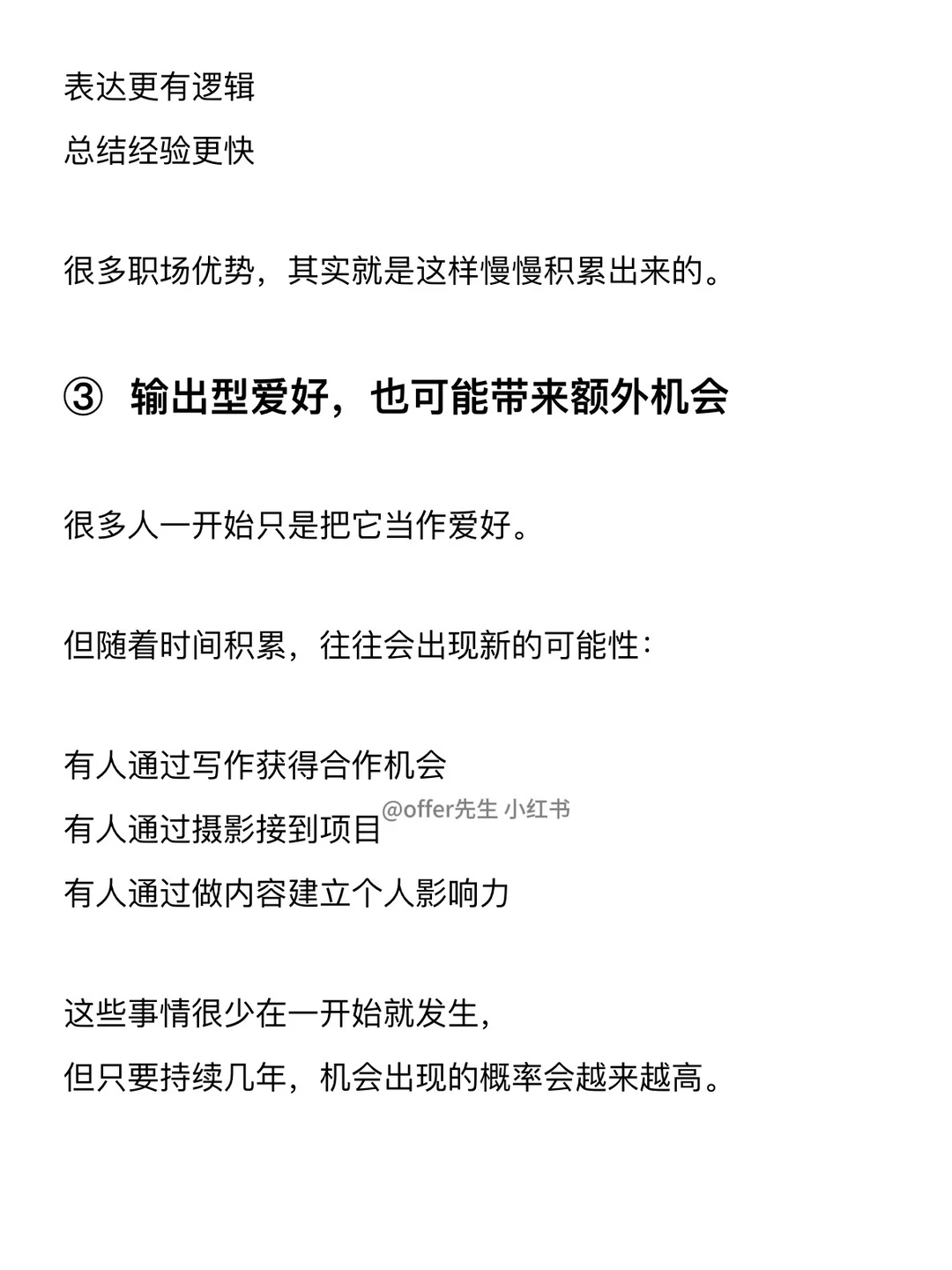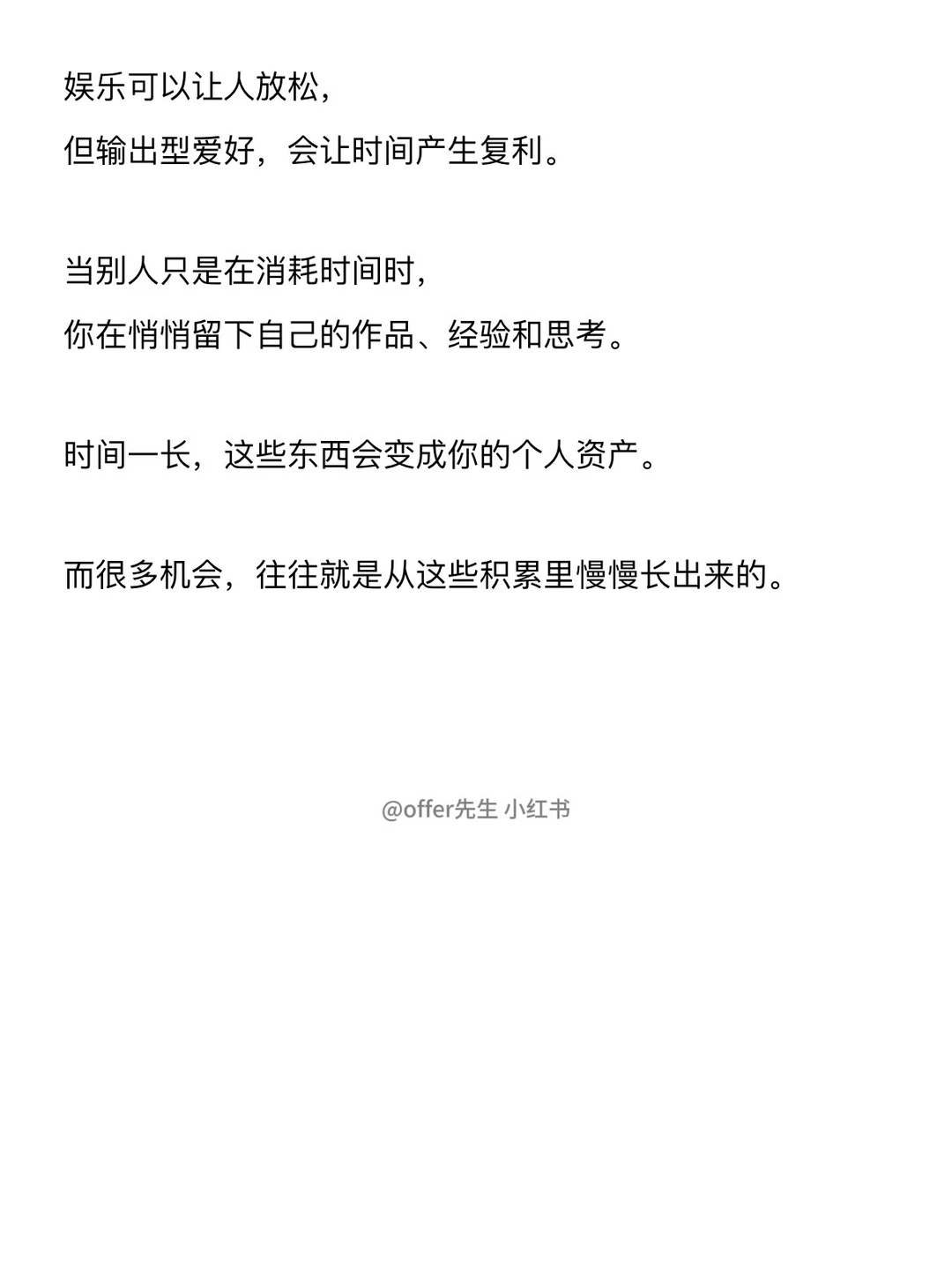 很多人的业余时间,其实都在“消耗型娱乐”里度过。 刷视频、看剧、打游戏。 当下很放松,但时间久了,你会发现—— 除了情绪被消耗,很少留下真正的积累。 如果可以,建议尽早培养一个输出型爱好。 因为长期来看,它带来的价值,往往会在几年后慢慢体现出来。 … 一个认真分享“找工作”干货的账号,真诚、有料、不说空话 ·