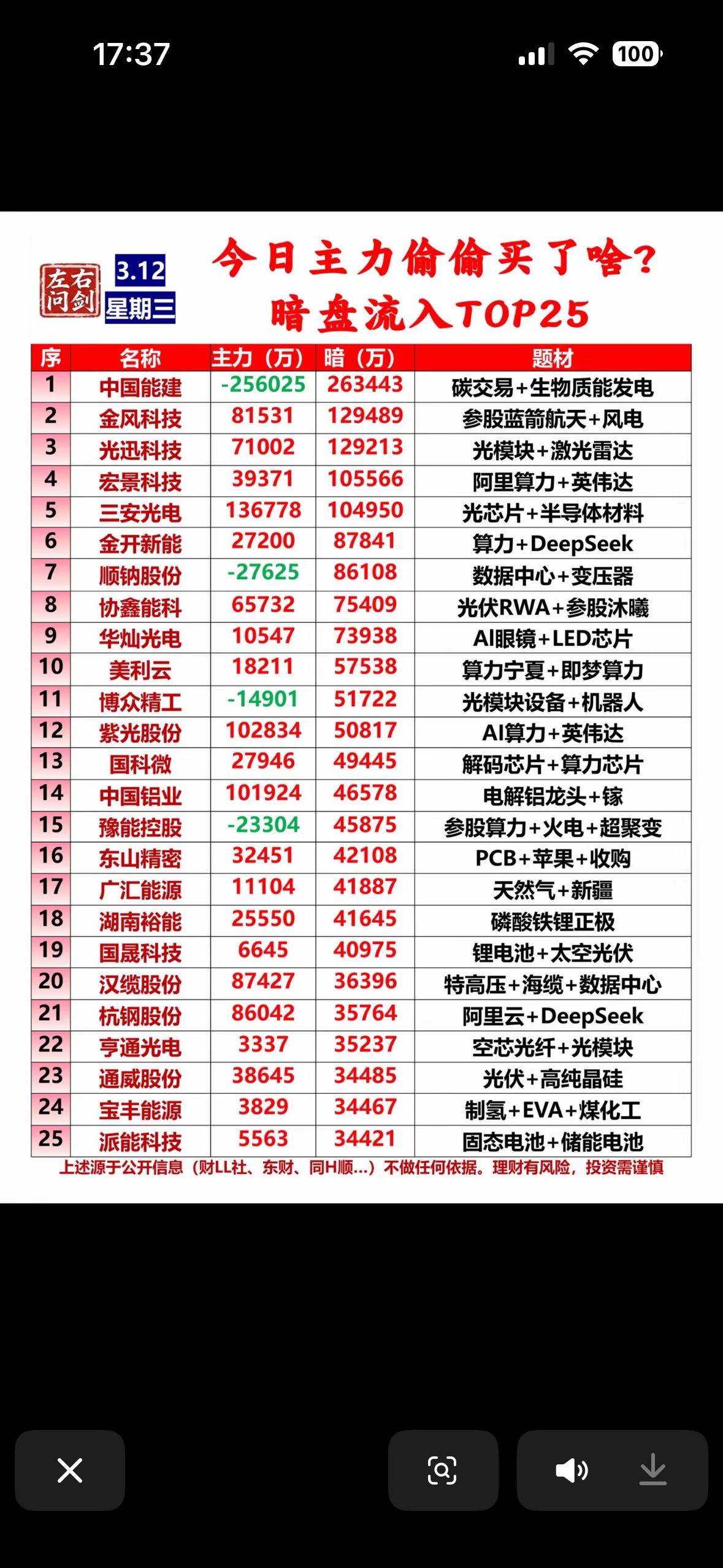 3月12今日主力偷偷买入TOP25,暗盘流入揭秘!🔥💰 3月12日的股市有点热闹!收盘时不少个股迎来主力资金大幅买入。像三安光电当日净流入13.6亿,最新价18.74元;中国铝业净流入9.75亿,最新价14.76元。 暗盘方面也有大动作。南网能源暗盘流入3.85亿,涉及虚拟电厂和零碳园区,还有扭亏为盈预期。利通电子布局算力租赁,还和英伟达合作。中国电建涉及绿电和商业航天,还是央企。三安光电在前沿技术领域有布局。利新能源搞储能扩张和风电光伏。南网数字布局算电协同和网络安全,同样有央企背景。这些资金流向,说不定藏着不少投资机会呢!