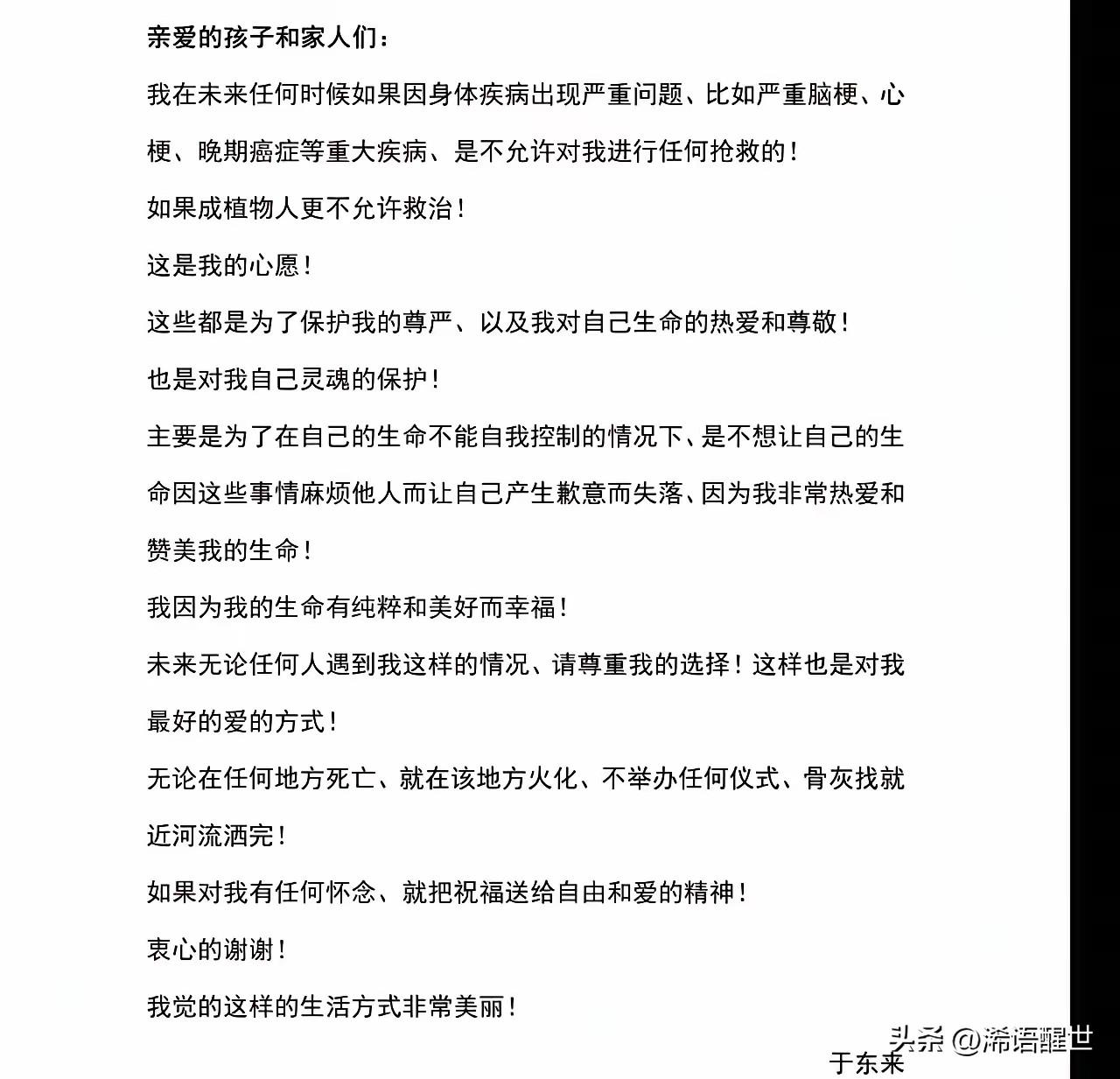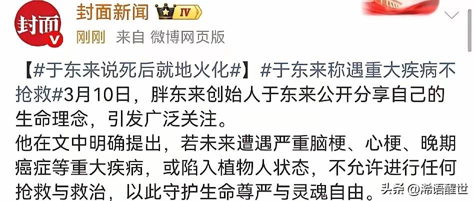 2026年3月10日,胖东来创始人于东来正式公开自己的身后事安排,清醒又让人肃然起敬。他明确表示,若遭遇重疾、脑梗、心梗或植物人状态,拒绝过度抢救,守护生命最后的尊严;离世后就地火化,不办任何仪式、不设灵堂、不建墓不立碑,骨灰就近撒入河流,只愿大家把祝福留给自由与爱。 看完真的无比敬佩,于东来一生通透豁达,连生死都看得如此淡然。不折腾、不铺张、不留形式,这份对生命的尊重与洒脱,远比任何排场都更有力量,这才是真正活明白了。