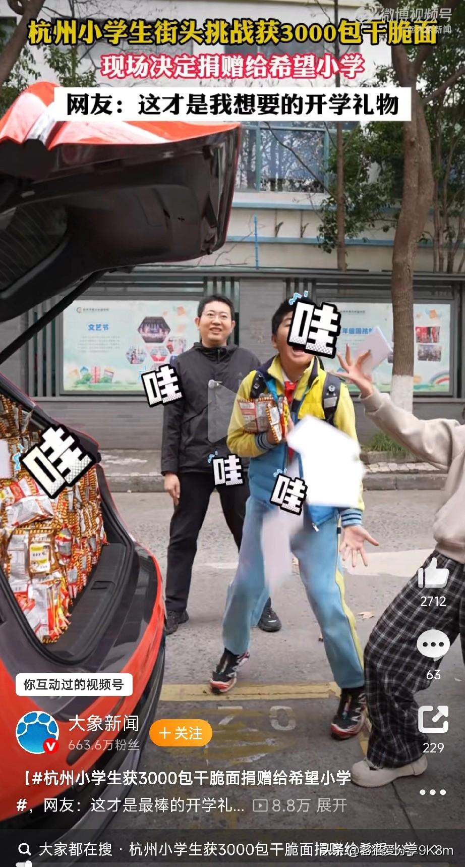 杭州一小学生开学第一天,直接赢走3000包干脆面! 重点是他扭头全捐给了希望小学,网友炸锅:这才是真·后浪! 事情是这样的:杭州上城区某小学门口,一辆装满干脆面的车引围观。搞了个新能源汽车知识挑战,结果被一个六年级男孩给“秒杀”了! 这孩子直接拿下第一,3000包干脆面带回家——啥概念?每天当早饭能吃8年多! 但让人破防的是,他毫不犹豫全捐给希望小学的小朋友了。 记者问他为啥,孩子特淡定:“我从小就喜欢车,家里全是车模和杂志,平时就刷这些知识。干脆面给更多人分享快乐,多好。” 3000包干脆面,哪个小学生不心动?但这孩子说捐就捐,一点不犹豫。 评论区炸了: “家里得有多好的教育才能养出这样的孩子”, “知识是真的力量,3000包干脆面的力量”。 说实话,比起那些炫富的“小网红”,这种有料有爱的娃,才是真正该火的“别人家的孩子”。 知识赢了面,爱心暖了心。这届小学生,真的可以! (文章素材来自大象新闻,侵删)
