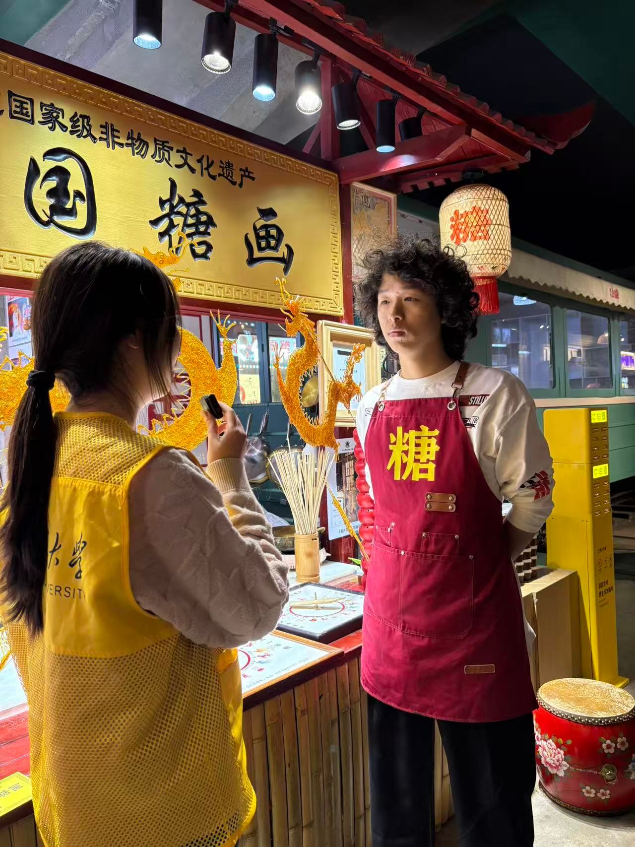 当有游客驻足询问时,队员们便接过王老师递来的金龙糖画,一边展示糖丝的细腻光泽,一边讲解南北方糖画在原料、题材上的差异,让这份清甜的技艺被更多人看见。