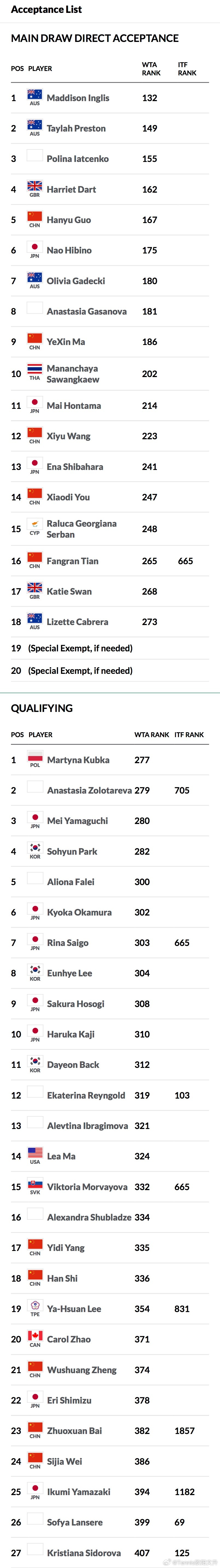 🇨🇳郭涵煜、🇨🇳马烨欣、🇨🇳田方然等入围正赛🇨🇳韦思佳、🇨🇳杨一迪、🇨🇳郑妩双等入围资格赛