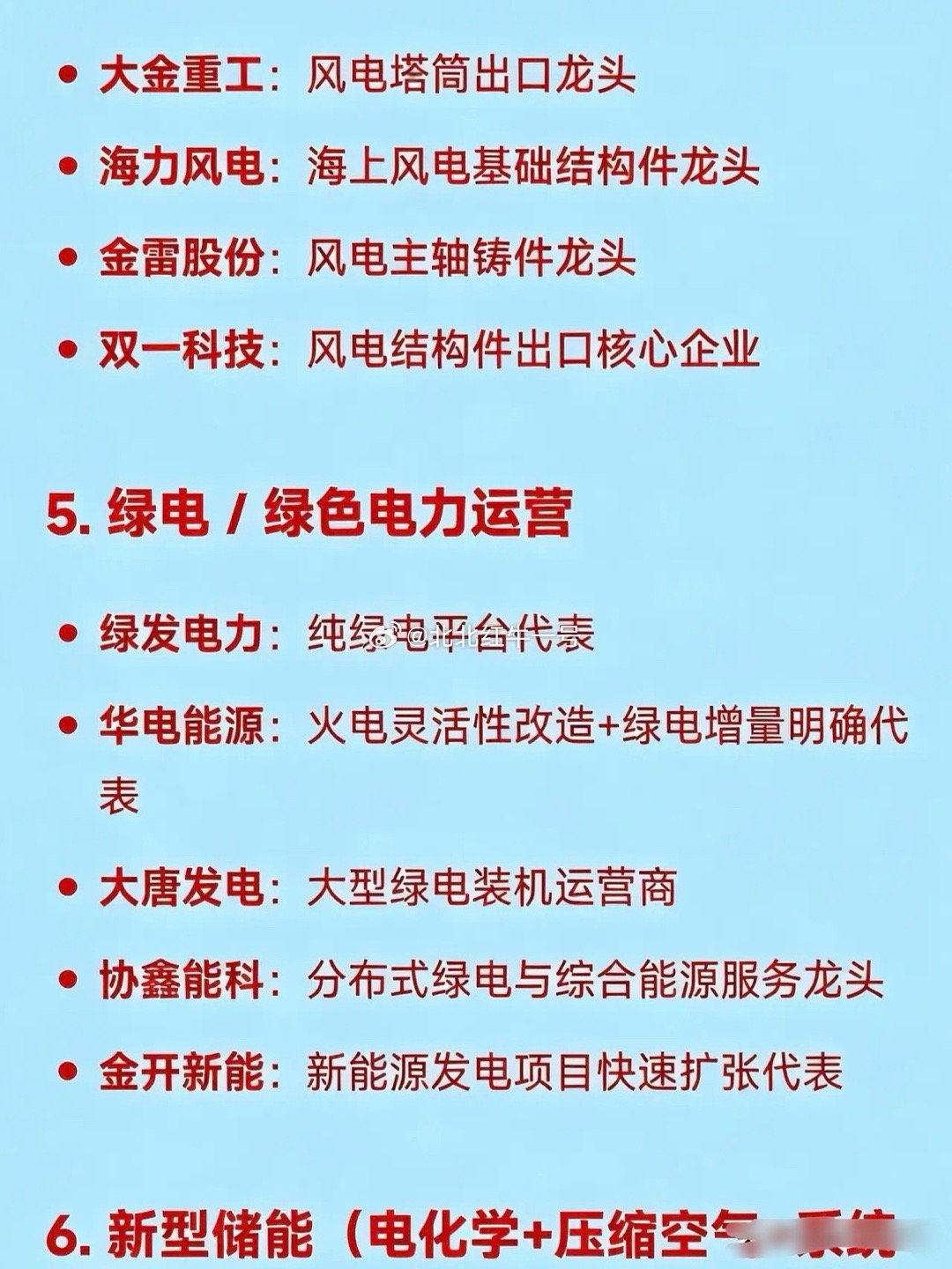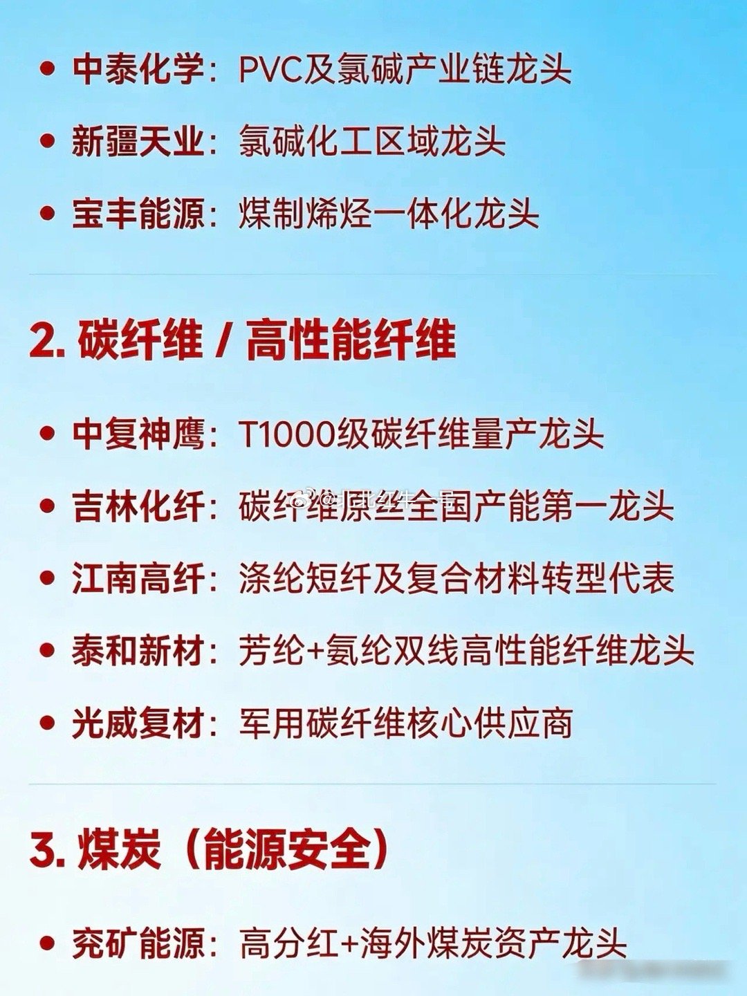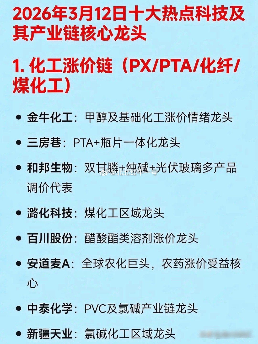 2026年3月12日十大热点科技及其产业链核心龙头1. 化工涨价链(PX/PTA/化纤/煤化工)金牛化工:甲醇及基础化工涨价情绪引领者三房巷:PTA+瓶片一体化领军企业和邦生物:双甘膦+纯碱+光伏玻璃多产品调价典型代表潞化科技:煤化工区域龙头企业百川股份:醋酸酯类溶剂涨价龙头安道麦A:全球农化巨头,农药涨价核心受益方中泰化学:PVC及氯碱产业链龙头新疆天业:氯碱化工区域龙头宝丰能源:煤制烯烃一体化龙头2. 碳纤维 / 高性能纤维中复神鹰:T1000级碳纤维量产龙头吉林化纤:碳纤维原丝全国产能第一企业江南高纤:涤纶短纤及复合材料转型典型泰和新材:芳纶+氨纶双线高性能纤维龙头光威复材:军用碳纤维核心供应商3. 煤炭(能源安全)兖矿能源:高分红+海外煤炭资产龙头郑州煤电:区域火电保供+煤炭弹性标的中煤能源:煤电一体化央企龙头陕西黑猫:焦化副产品涨价受益代表4. 风电(整机+海风+零部件出口)节能风电:央企风电运营龙头明阳智能:海上风电整机出海龙头金风科技:全球陆上风电整机龙头东方电缆:海缆环节绝对龙头大金重工:风电塔筒出口龙头海力风电:海上风电基础结构件龙头金雷股份:风电主轴铸件龙头双一科技:风电结构件出口核心企业5. 绿电 / 绿色电力运营绿发电力:纯绿电平台代表华电能源:火电灵活性改造+绿电增量明确代表大唐发电:大型绿电装机运营商协鑫能科:分布式绿电与综合能源服务龙头金开新能:新能源发电项目快速扩张代表6. 新型储能(电化学+压缩空气+系统集成)纳百川:户储逆变器新锐龙头正泰电源:工商业储能系统集成龙头阳光电源:全球储能变流器龙头宁德时代:动力电池+大型储能电芯龙头派能科技:户用储能电池系统龙头鹏辉能源:储能电池多元化应用代表德业股份:微型逆变器+储能逆变器双轮驱动龙头7. 算电协同 / 智算中心绿电配套中国能建:算电协同项目最多央企龙头协鑫能科:液冷超充+智算中心电源解决方案先行者美利云:西部算力枢纽+数据中心绿电直供代表8. 并购重组 / 国企改革预期宁波建工:数据中心资产注入预期龙头中南文化:并购重组题材情绪龙头德龙汇能:控制权变更后治理结构重塑代表9. 高端制造 / 工业母机秦川机床:齿轮/丝杠等核心功能部件国产化龙头华中数控:高端数控系统自主可控代表海天精工:高端数控机床整机出口龙头10. 商业航天(卫星应用+发射服务)三安光电:太空光伏芯片潜在供应商振江股份:航天结构件+风电双轮驱动代表联创光电:超导磁体用于电磁发射技术中标企业航天电器:航天连接器核心供应商