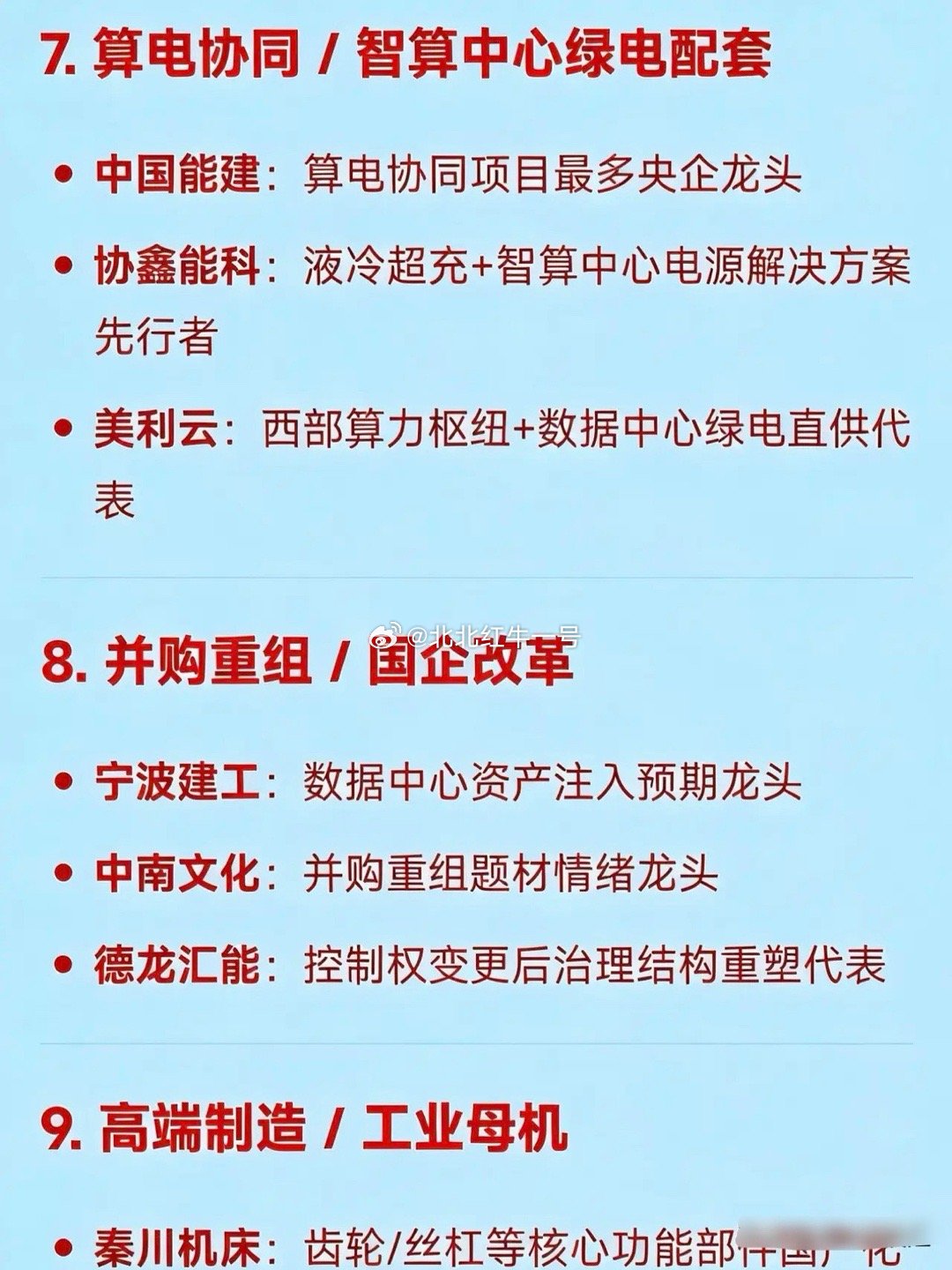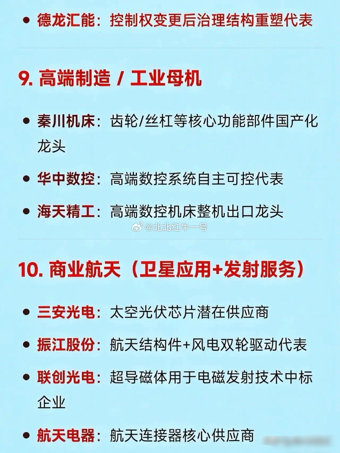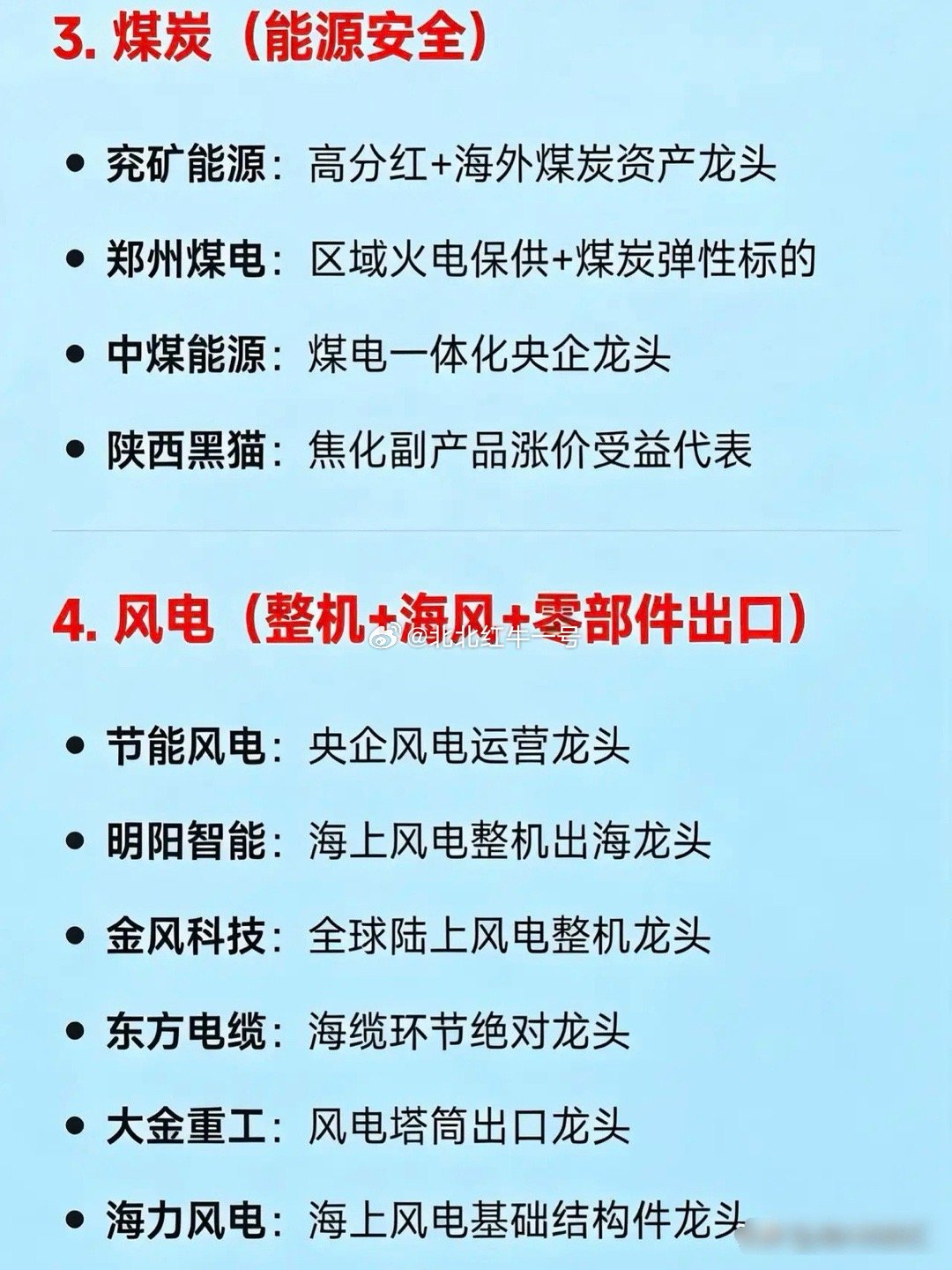 2026年3月12日十大热点科技及其产业链核心龙头1. 化工涨价链(PX/PTA/化纤/煤化工)金牛化工:甲醇及基础化工涨价情绪引领者三房巷:PTA+瓶片一体化领军企业和邦生物:双甘膦+纯碱+光伏玻璃多产品调价典型代表潞化科技:煤化工区域龙头企业百川股份:醋酸酯类溶剂涨价龙头安道麦A:全球农化巨头,农药涨价核心受益方中泰化学:PVC及氯碱产业链龙头新疆天业:氯碱化工区域龙头宝丰能源:煤制烯烃一体化龙头2. 碳纤维 / 高性能纤维中复神鹰:T1000级碳纤维量产龙头吉林化纤:碳纤维原丝全国产能第一企业江南高纤:涤纶短纤及复合材料转型典型泰和新材:芳纶+氨纶双线高性能纤维龙头光威复材:军用碳纤维核心供应商3. 煤炭(能源安全)兖矿能源:高分红+海外煤炭资产龙头郑州煤电:区域火电保供+煤炭弹性标的中煤能源:煤电一体化央企龙头陕西黑猫:焦化副产品涨价受益代表4. 风电(整机+海风+零部件出口)节能风电:央企风电运营龙头明阳智能:海上风电整机出海龙头金风科技:全球陆上风电整机龙头东方电缆:海缆环节绝对龙头大金重工:风电塔筒出口龙头海力风电:海上风电基础结构件龙头金雷股份:风电主轴铸件龙头双一科技:风电结构件出口核心企业5. 绿电 / 绿色电力运营绿发电力:纯绿电平台代表华电能源:火电灵活性改造+绿电增量明确代表大唐发电:大型绿电装机运营商协鑫能科:分布式绿电与综合能源服务龙头金开新能:新能源发电项目快速扩张代表6. 新型储能(电化学+压缩空气+系统集成)纳百川:户储逆变器新锐龙头正泰电源:工商业储能系统集成龙头阳光电源:全球储能变流器龙头宁德时代:动力电池+大型储能电芯龙头派能科技:户用储能电池系统龙头鹏辉能源:储能电池多元化应用代表德业股份:微型逆变器+储能逆变器双轮驱动龙头7. 算电协同 / 智算中心绿电配套中国能建:算电协同项目最多央企龙头协鑫能科:液冷超充+智算中心电源解决方案先行者美利云:西部算力枢纽+数据中心绿电直供代表8. 并购重组 / 国企改革预期宁波建工:数据中心资产注入预期龙头中南文化:并购重组题材情绪龙头德龙汇能:控制权变更后治理结构重塑代表9. 高端制造 / 工业母机秦川机床:齿轮/丝杠等核心功能部件国产化龙头华中数控:高端数控系统自主可控代表海天精工:高端数控机床整机出口龙头10. 商业航天(卫星应用+发射服务)三安光电:太空光伏芯片潜在供应商振江股份:航天结构件+风电双轮驱动代表联创光电:超导磁体用于电磁发射技术中标企业航天电器:航天连接器核心供应商