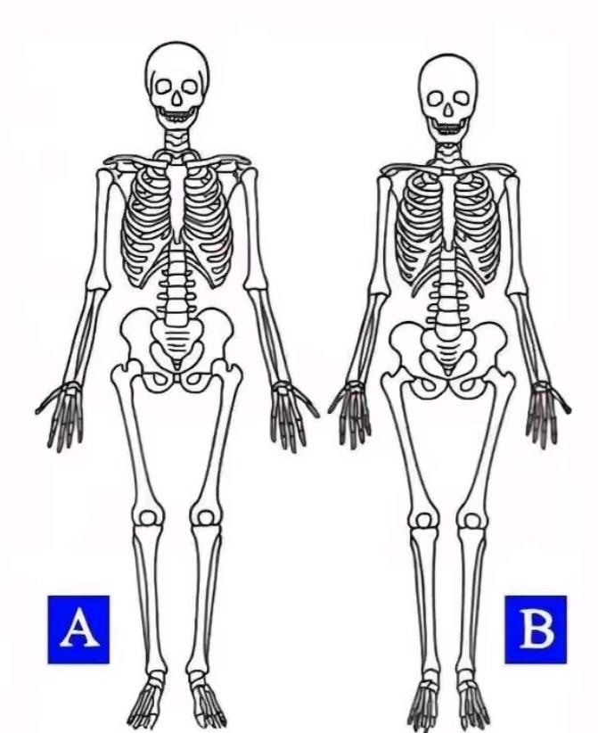 这是两架人体骨架图?你能分出哪架是男的,哪一架是女的吗?我们都知道自己的身体的样子,但是如果只让你看骨架你能区分出男女来吗?给你一些有阶值的建议,你可以通过喉结,两人的肩膀,两人的骨盆宽窄这些条件去进行区分,看你对人体的肯骼知识掌据多少。