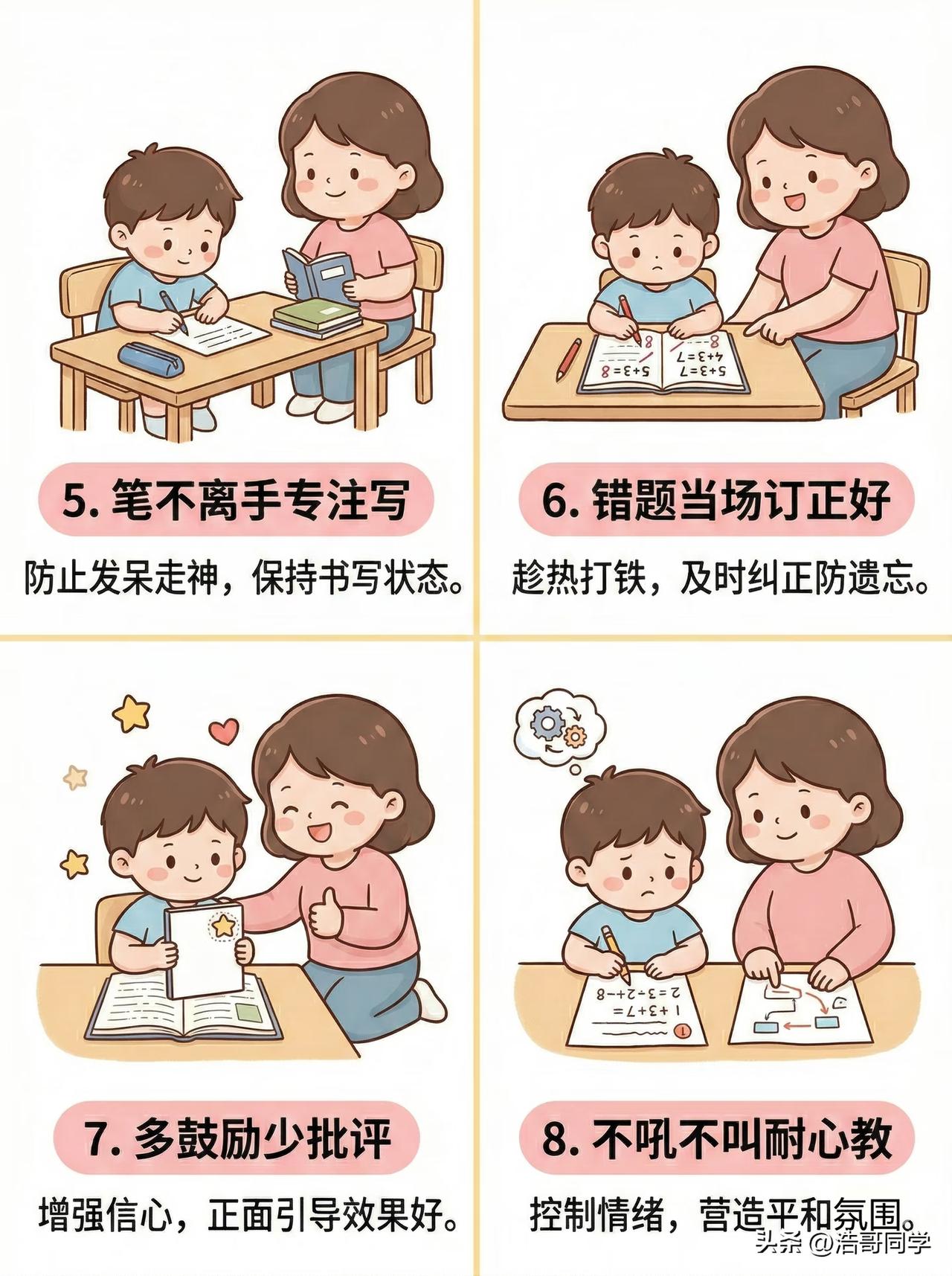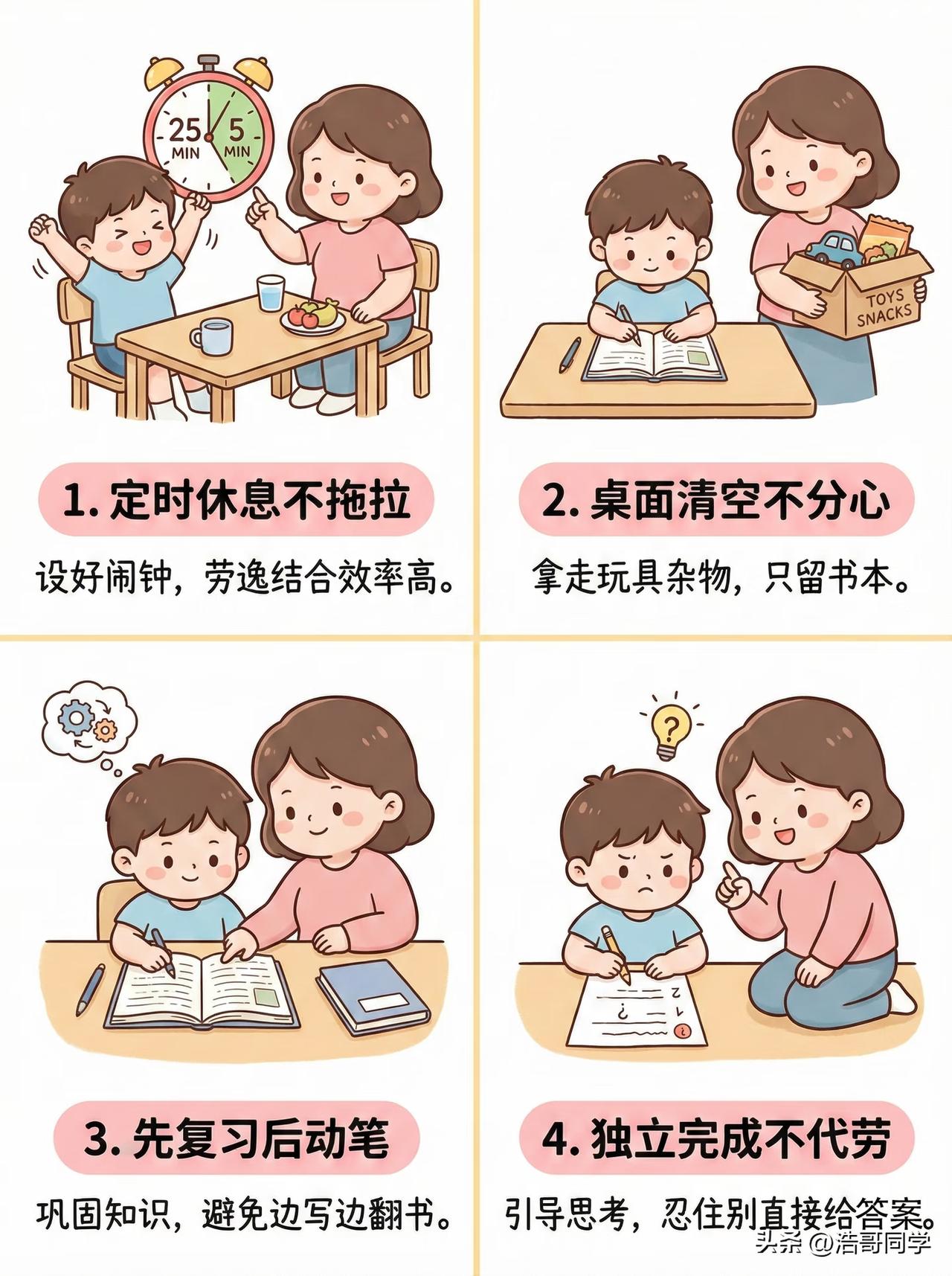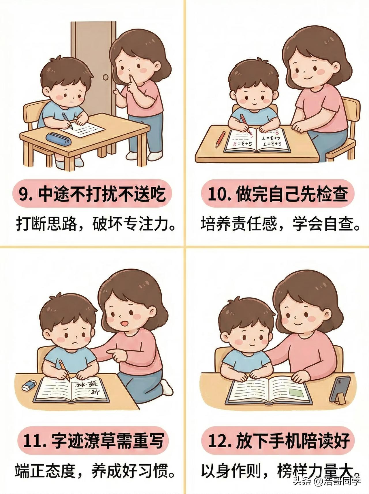 陪孩子写作业的12条铁律! 其实,家里的孩子从幼儿园刚上小学的那段时间,他们的专注能力会特别弱,三年幼儿园的玩耍时间,都是过着放松的上课时光。一旦进入了小学阶段上课就要开始记忆老师所教的知识点,到了晚上做作业就是巩固上课学的知识,完成理论到运用的一个过程。 家长要做的就是,为孩子学习营造一个舒适的学习环境,而且还要让孩子养成独立完成学习的好习惯,即使做错了,也要让他们学会自己订正,这样他们才能进步。等他们养成了系统的学习方法,家长也会变得很轻松,只要他们做完检查一遍就行了。 图片来源:比芯成长中心 娃不拖作业方法 家长督促作业 孩子写作业禁忌 家长监督写作业 写作业误区 小学生作业管理 小学生作业方法