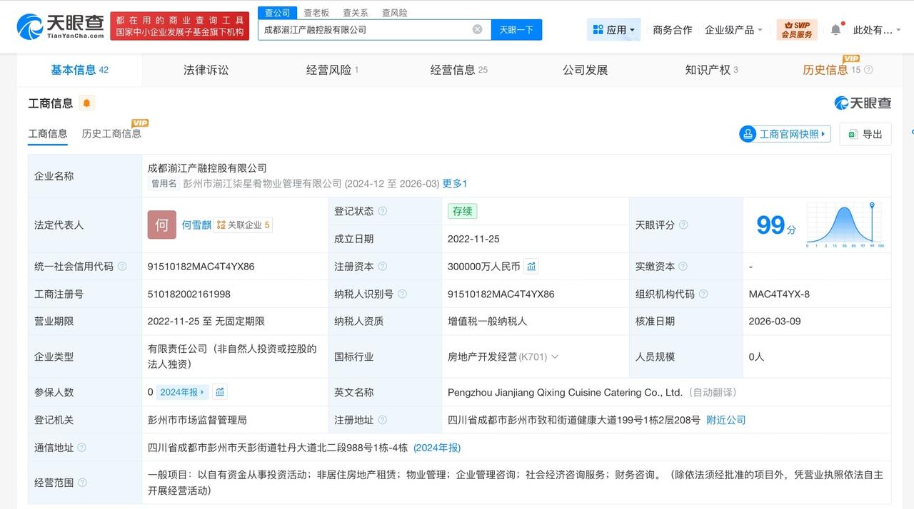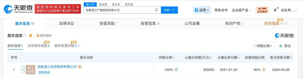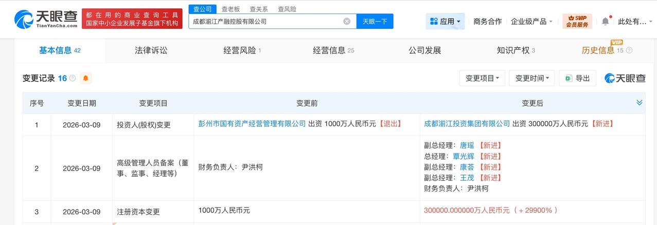成都湔江产融控股公司增资至30亿 增幅29900% 天眼查工商信息显示,近日,成都湔江产融控股有限公司发生工商变更,注册资本由1000万人民币增至30亿人民币,增幅29900%,原股东彭州市国有资产经营管理有限公司退出,新增成都湔江投资集团有限公司为股东并全资持股,同时,多位高管发生变更。 该公司成立于2022年11月,法定代表人为何雪麒,经营范围包括以自有资金从事投资活动、非居住房地产租赁、物业管理、企业管理咨询等。 天眼查信息: