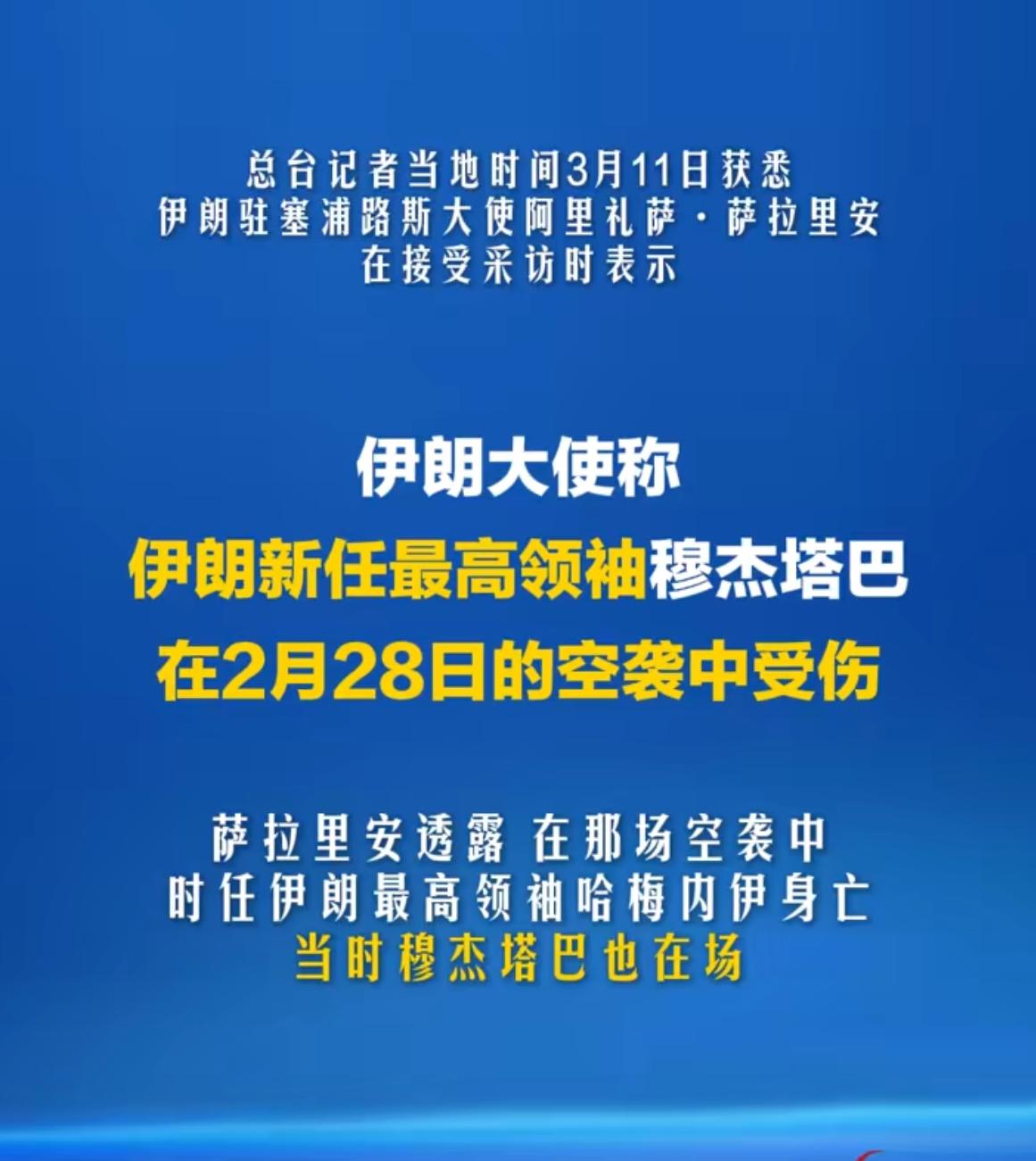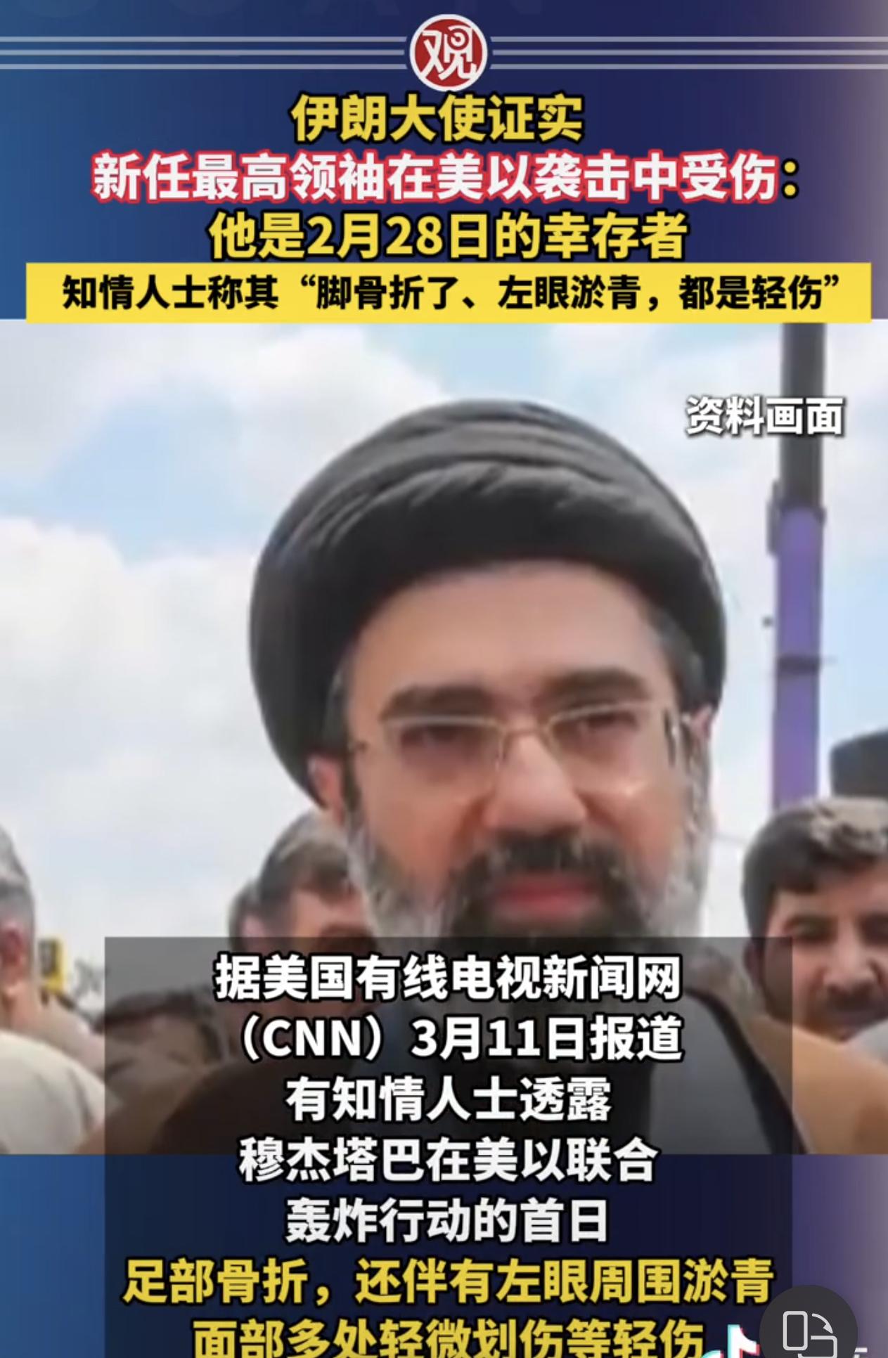 在开战第一天,哈梅内伊本人身亡,他的妻子、女儿、女婿、孙子和孙女也都身亡,唯独留下儿子小哈梅内伊。经证实,小哈梅内伊也受伤了,脚骨骨折,左眼淤青。小哈梅内伊全家就剩他一个,心理估计已经黑化了。