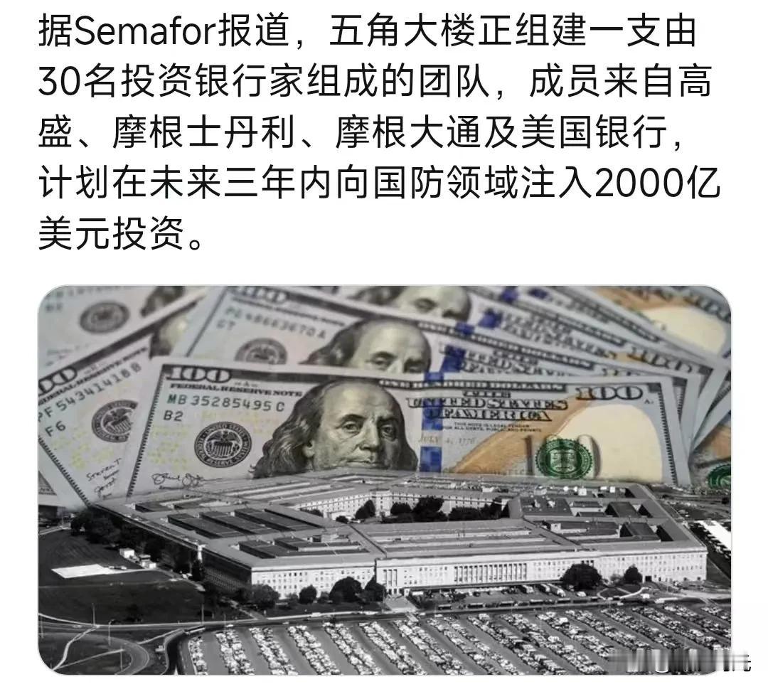 五角大楼正组建一支由30名投资银行家组成的团队,成员来自高盛、摩根士丹利、摩根大通及美国银行,计划在未来三年内向国防领域注入2000亿美元投资。