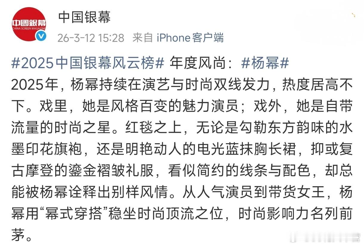 魅力演员,时尚之星,人气演员,带货女王!幂式穿搭稳坐时尚顶流之位!2025中国银幕风云榜