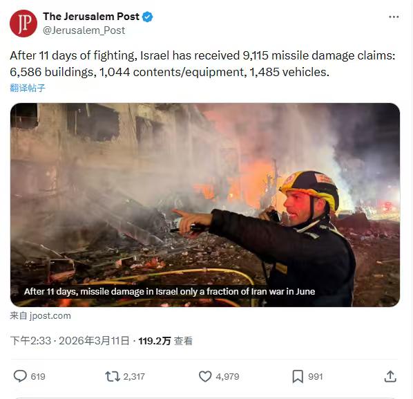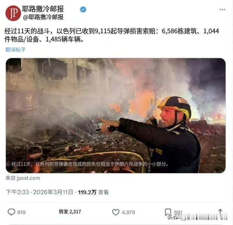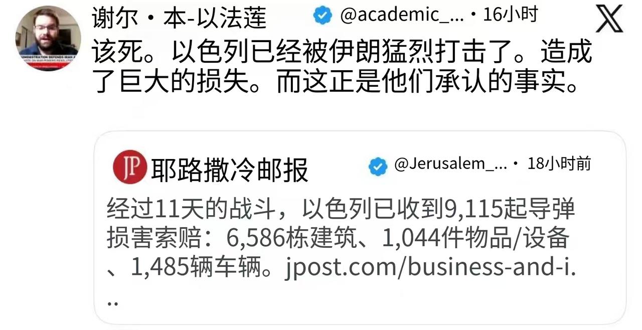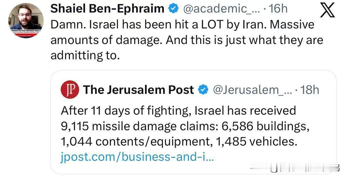 哎呀,以色列媒体难得说一回实话,这让挺乌又挺以简中大殖子们脸往哪搁啊? 耶路撒冷邮报:经过11天的战斗,以色列已收到9,115起导弹损害索赔:6,586栋建筑,1,044件物品/设备,1,485辆车辆。 而以色列的导弹袭击,对伊朗造成的损失仅相当于去年伊朗在“十二日战争”的一小部分。 此外,据新华社3月12日报道,伊朗伊斯兰革命卫队12日凌晨宣布,已完成"真实承诺一4"行动第40轮攻势,与黎巴嫩真主党展开联合作战,打击以色列境内目标和位于中东地区的美军基地。 据以色列媒体报道,这是美国和以色列对伊朗发起大规模军事行动以来,伊朗和真主党"首次"对以色列发起协同打击。 美国和以色列这次是碰到硬茬了。中国有句老话送给它俩——多行不义必自毙! #美伊以冲突# #热点观点# #海外新鲜事#