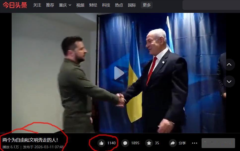 不知道大家还记得同时支持乌克兰和以色列的是什么吗?[奸笑] 居然这样一个视频也有6万多的播放,而且还有1000多的点赞。 如果这个人非要说泽连斯基是为了自由和文明,虽然我觉得不是那么回事,但我勉强还能接受。 但这个人要说内塔尼亚胡是为了自由和文明,这就像是他自己吃了一坨屎,还说真的很香,全世界人民都应该跟着他来吃,这特么就太恶心了。 点右上角关注我,我们一起去看这个魔幻的世界