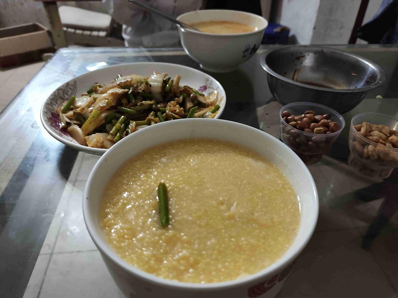 我的今日状态:😁轻松愉快 我这里的天气:☀️晴天 今晚不加班,老婆烧了玉米糁子,也炒了盘菜,这就是老俩口的晚饭。
