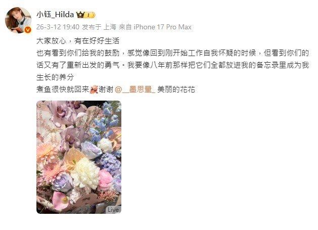"大家放心,有在好好生活,也有看到你们给我的鼓励,感觉像回到刚开始工作自我怀疑的时候,但看到你们的话又有了重新出发的勇气。我要像八年前那样把它们全都放进我的备忘录里成为我生长的养分"