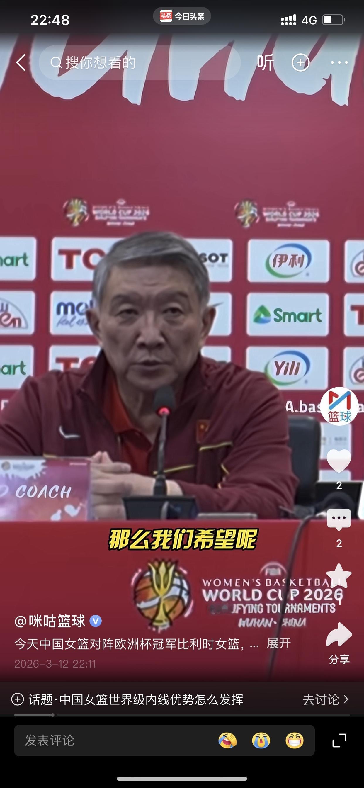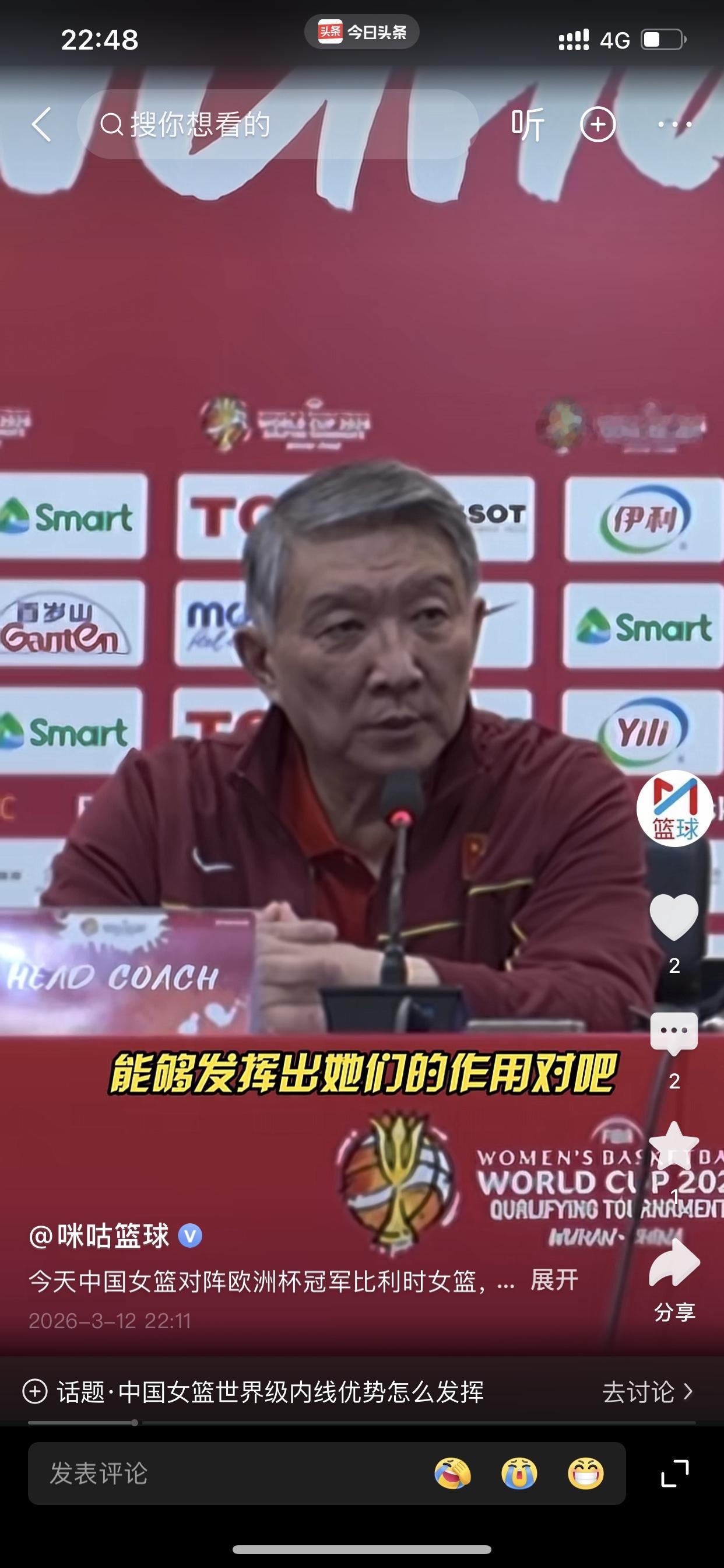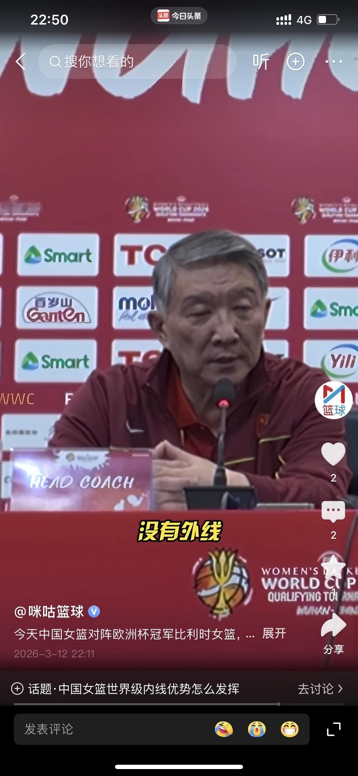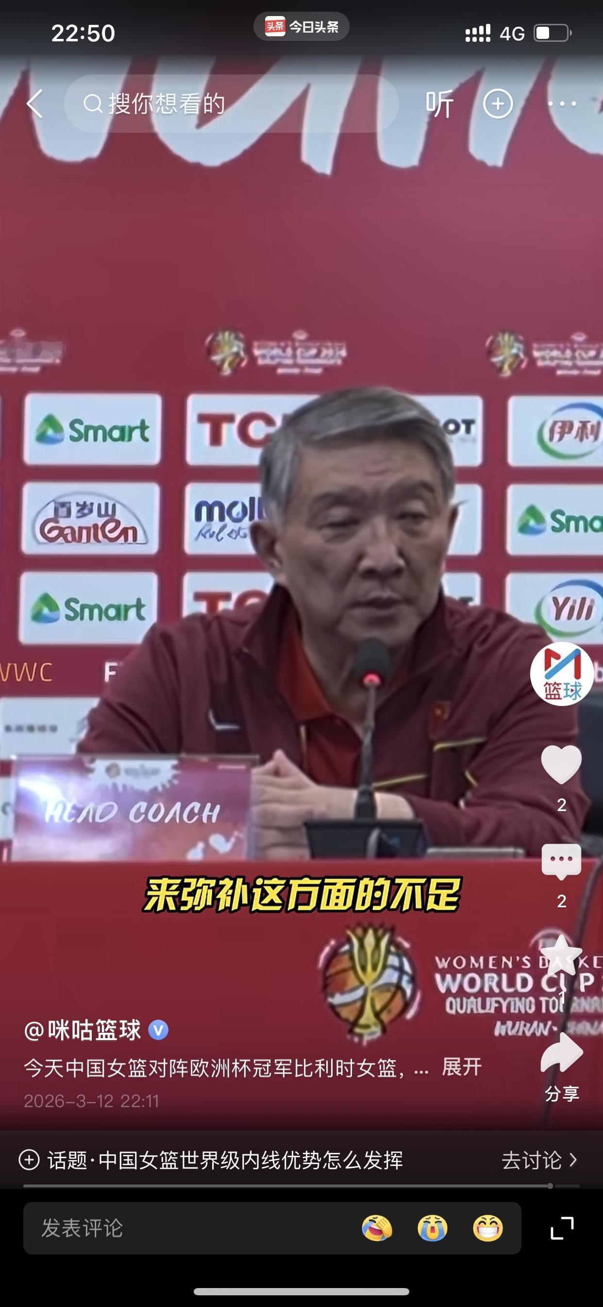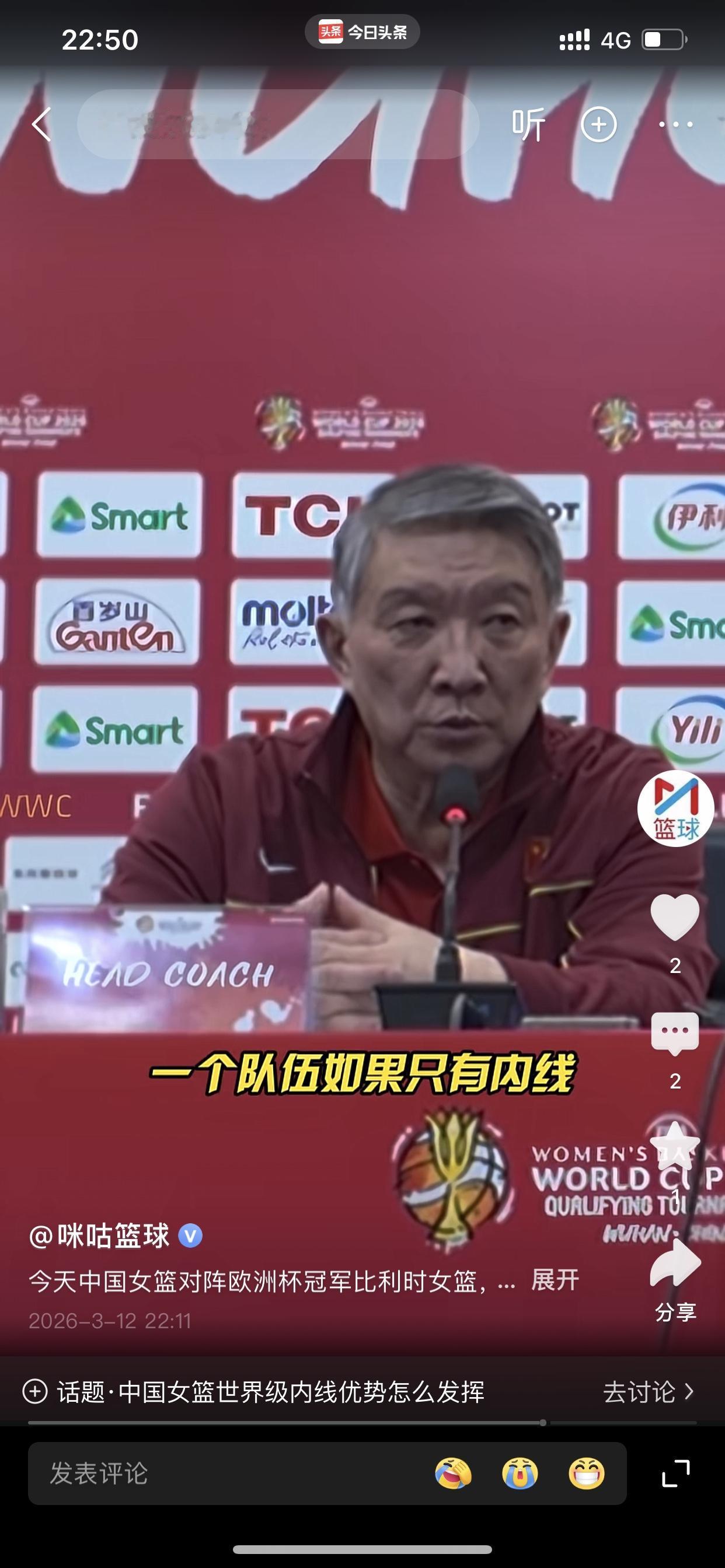 宫鲁鸣刚刚赛后发布会真会说啊 他说:“一个队伍,如果只有内线,没有外线,就不不是一支真正的强队,对此中国女篮教练组对此做了很多文章,来弥补外线的不足” 可是,我很想知道中国女篮教练组到底做了哪些文章,或者是怎么做的文章? 为什么连续两场,不管是打弱队,还是强队,外线三分都显的很一般? 完全就不是一支强队的表现! 难道这样说中国女篮就能进步了?还有他说打一场总结一场,从亚洲杯到现在,经历这么多比赛,三分球一直没有变好?这又是在总结什么? 还是说,中国女篮主教练只要在赛后新闻发布会上说好听的就行了吗?