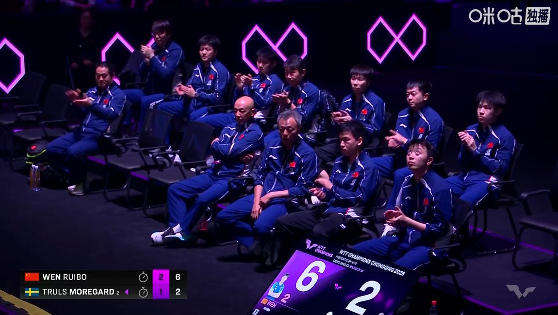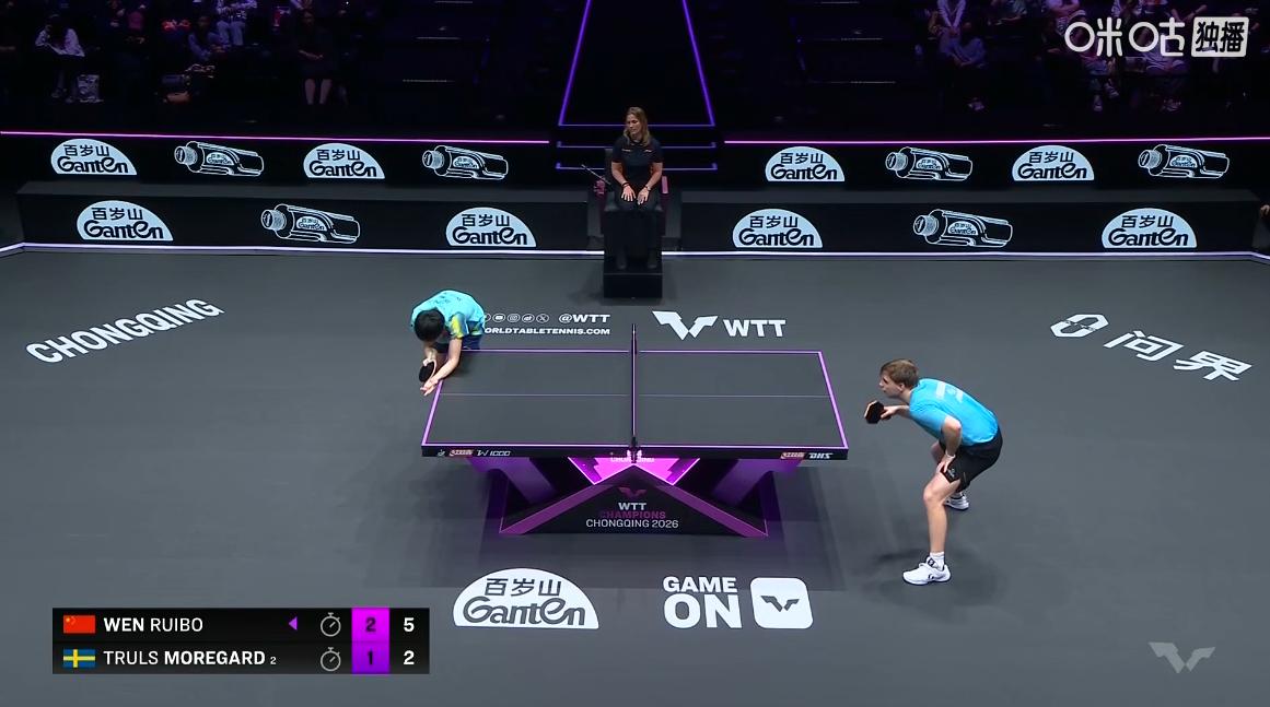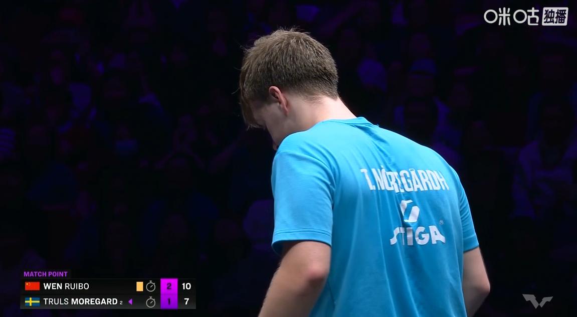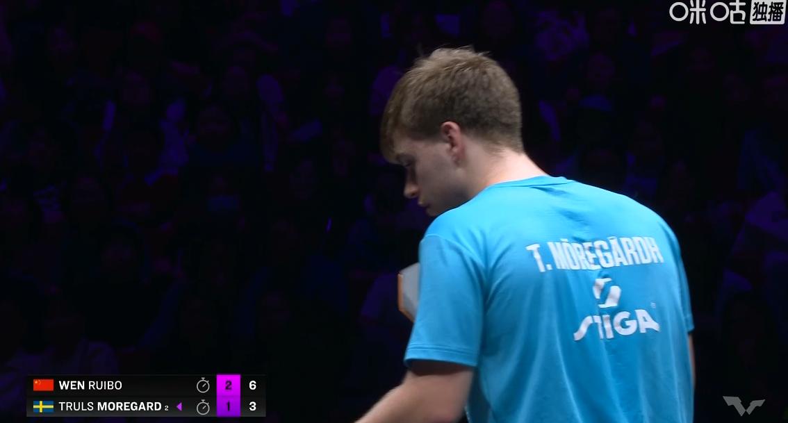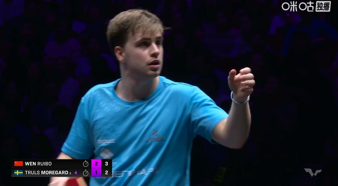莫雷加德被打急眼了,直接用脚去踢球, 幸好裁判没有计较,否则肯定要吃牌, 温瑞博越打越勇,第四局一上来打了一波3:0, 侯英超说了,温瑞博只要劈长,拧拉,这场比赛就能赢, 温瑞博还是太年轻,连续摆短被小莫抓住机会, 将比分追成4:2, 温瑞博继续打劈长,莫雷加德连续出现失误, 6:2,莫雷加德有点要崩, 温瑞博不能犹豫,继续劈长,拧拉, 温瑞博就是盯住了小莫的反手, 9:4,温瑞博越打越勇, 莫雷加德接发球失误, 10:6,温瑞博拿到赛点, 莫雷加德抓住温瑞博出手犹豫, 连追了2分,10:8, 温瑞博还是太想一板打死对手了, 温瑞博反手变直线,11:9锁定胜局, 3-1淘汰莫雷加德,成功晋级男单16强