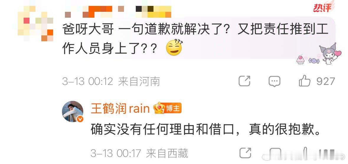 【王鹤润回应推卸责任】王鹤润称没有理由和借口 3月13日凌晨,就吐槽王玉雯事件被指甩锅工作人员,回复网友称:确实没有任何理由和借口,真的很抱歉。王鹤润方称工作人员失误