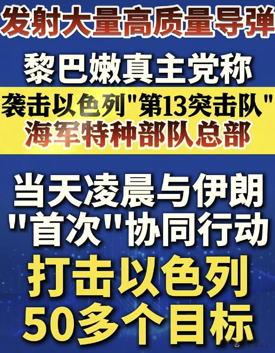 最新消息! 根据环球网报道称,黎巴内真主党和伊朗协同行动,打击以色列50多个目标,其中包括以色列海军特种部队总部。 伊朗的综合反击来了,黎巴嫩真主党侧击以色列,也门胡塞武装盯住红海,如果这个时候叙利亚在把戈兰高地收回来。根据如此局势发展下去,以色列现在估计投降都难,美军现在唯一的办法就是把全部军事力量都投过去,不然以色列是挺不住的。