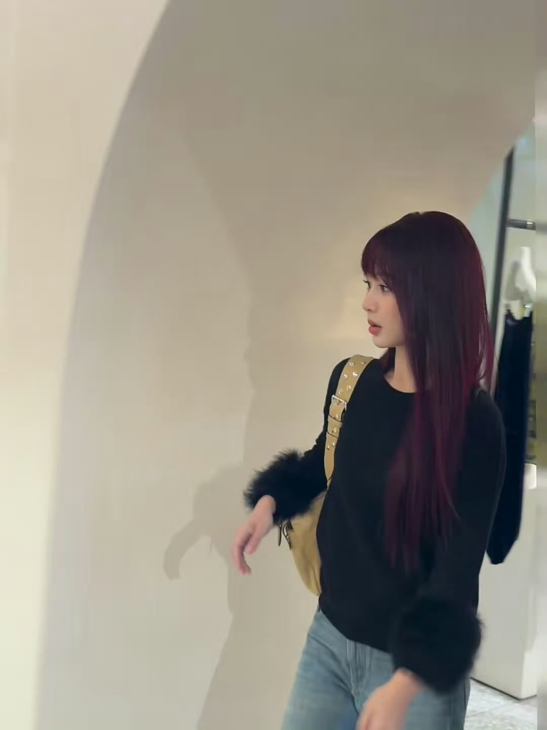 刘亦菲这条裤子挺养生,毕竟降温了肚脐眼必须护住啊