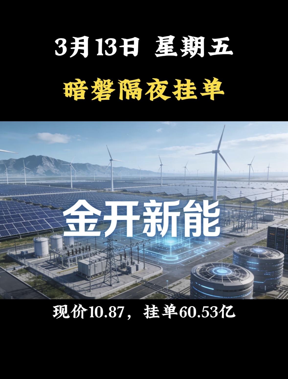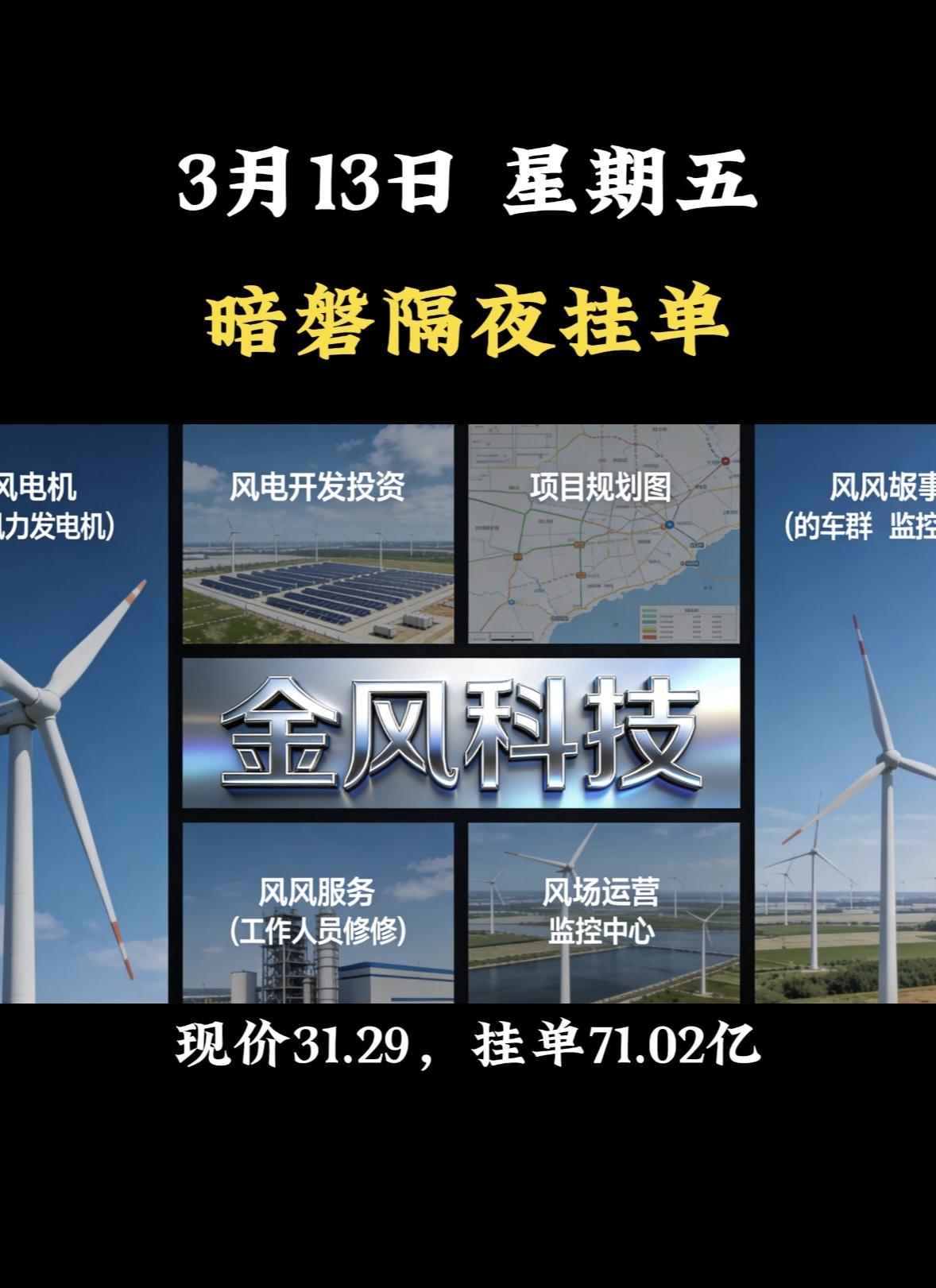 3月13日周五暗盘隔夜挂单个股梳理 3月13日金风科技暗盘挂单,现价31.29,挂单71.02亿。此前3月3日,它跌了6.33%,成交额70.17亿元,近5日主力净流入 -2.92亿。3月12日,A股整体震荡走弱,它却逆势收涨3.47%,不过盘中冲高到33元后大幅回落。当天成交显著放大,成交额146.91亿元,换手率14.22%,属于阶段性天量水平。这说明多空博弈进入白热化,短期方向还不明朗。而且它涉及商业航天、海工装备等概念,持有蓝箭航天8.3%股权,还有风电安装平台等,后续走势值得关注。