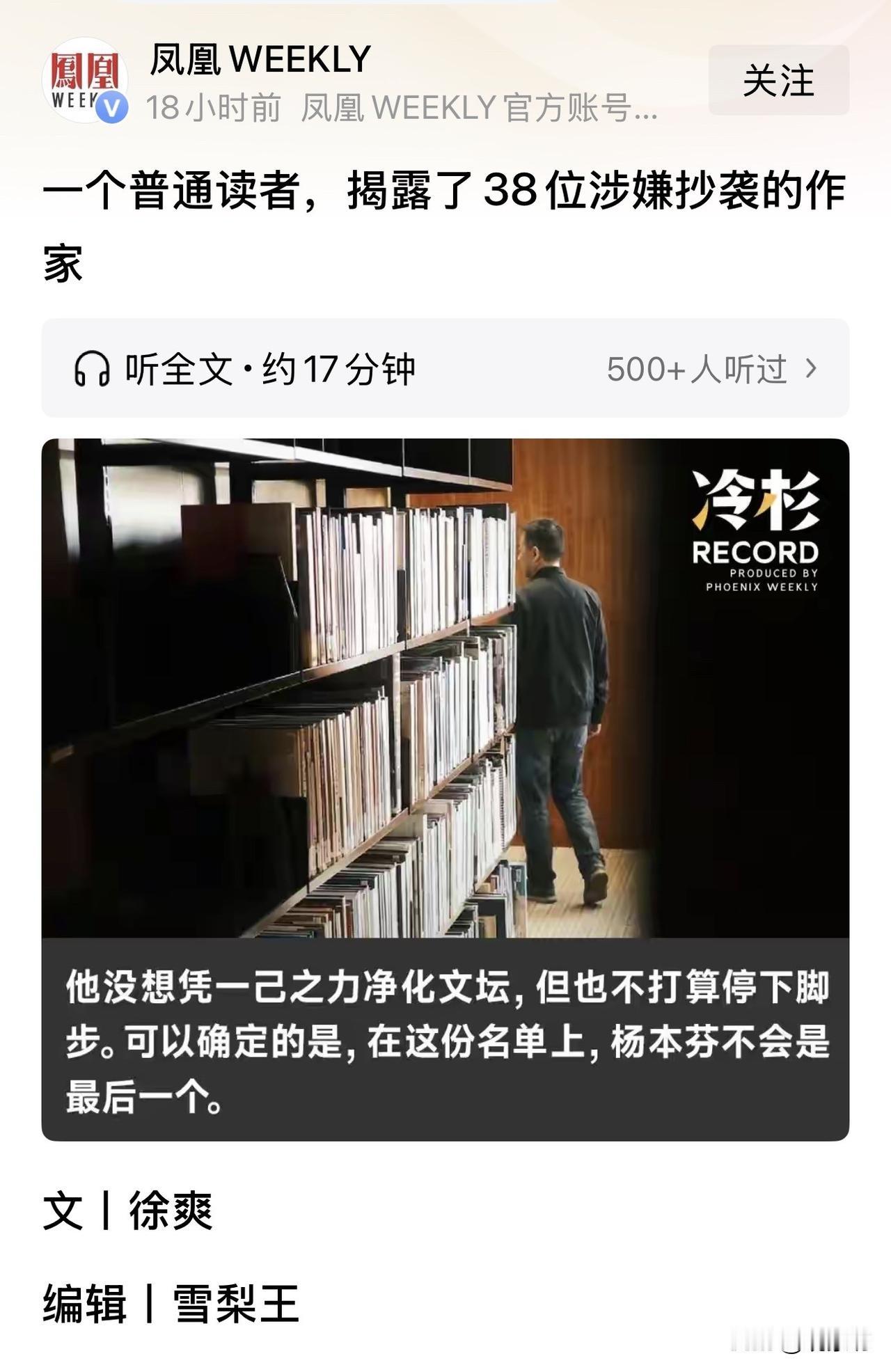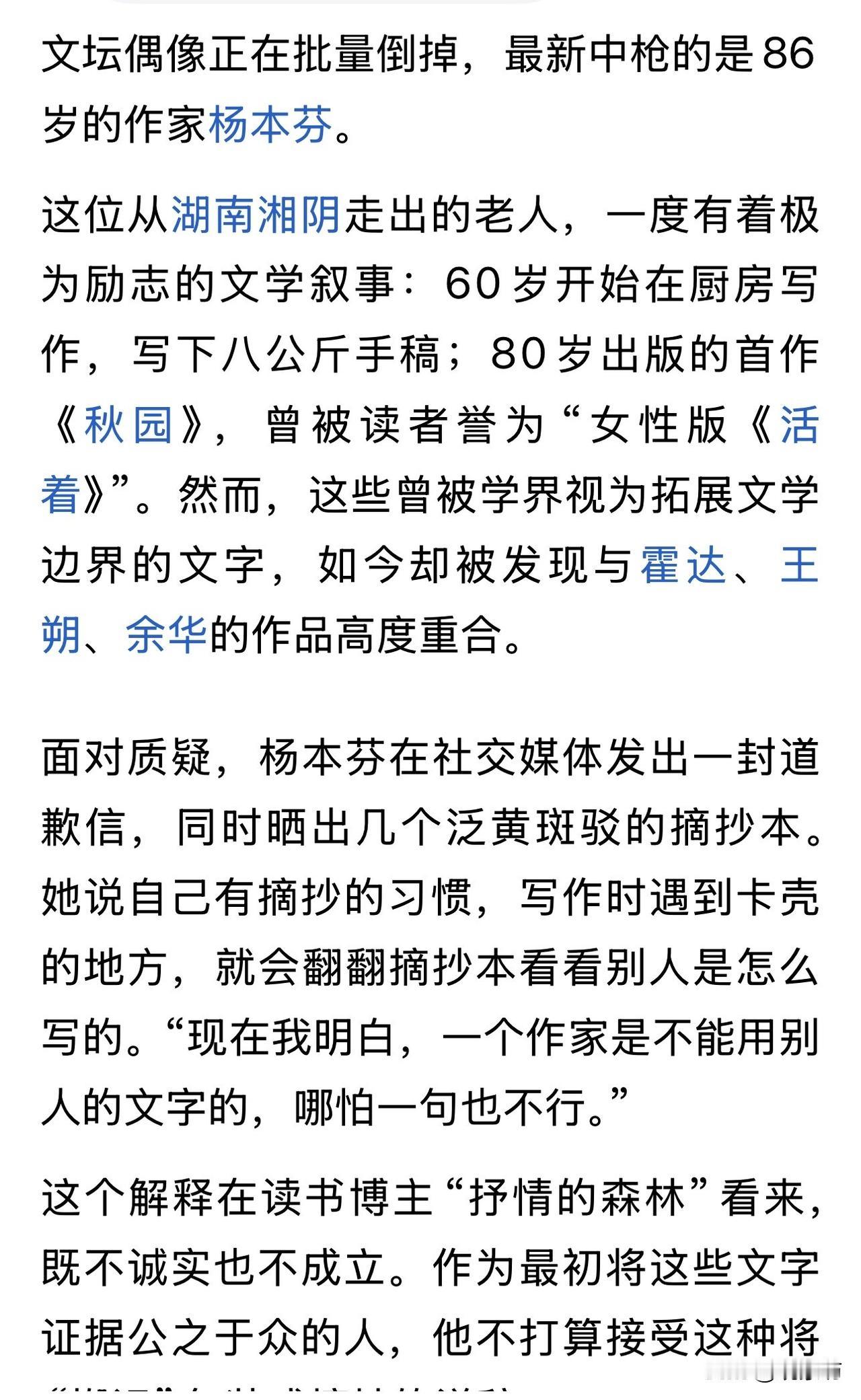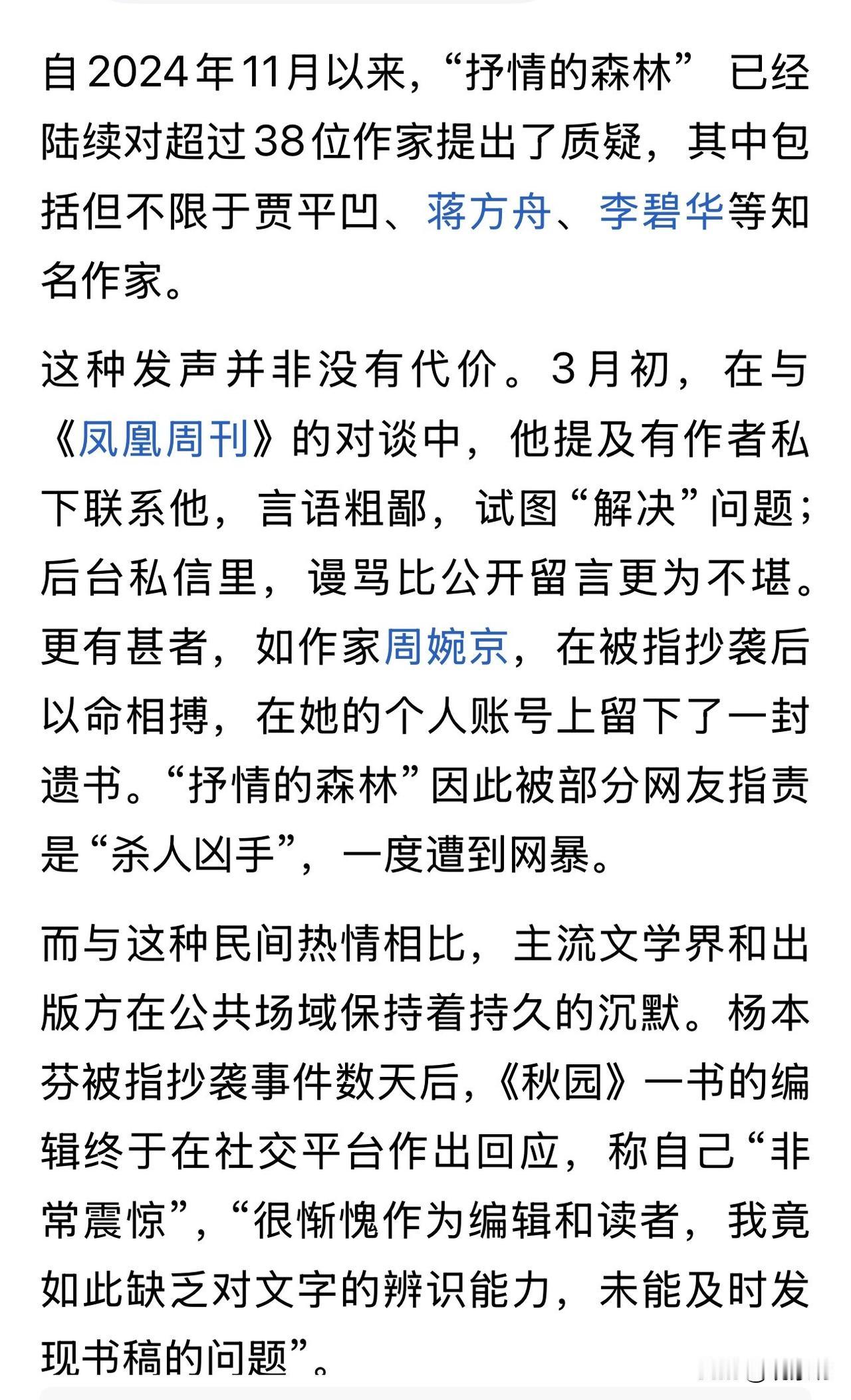 文坛的滤镜,正在被一位普通读者亲手撕碎。 2024 年末以来,网名“抒情的森林”的博主如同一位孤独的守夜人,凭借一己之力掀起了席卷中国文学界的“鉴抄风暴”。从被誉为“女性版《活着》”的杨本芬,到享誉海内外的贾平凹、蒋方舟、李碧华等三十余位知名作家,纷纷被推上舆论的风口浪尖。证据确凿的文本对比图显示,这些曾被奉为圭臬的作品中,竟藏着大量与霍达、余华、王朔乃至国外经典著作高度重合的段落。面对铁证,有人以“摘抄习惯”为由轻描淡写地道歉,有人试图用“无意识化用”来混淆视听,更有甚者选择沉默或以极端方式对抗。这场风波不仅揭露了个别作家的道德瑕疵,更狠狠扇了主流出版界和文学评论界一记响亮的耳光。 我们感到愤怒,更感到深深的失望。这些作家享受着读者的崇拜、媒体的追捧以及巨额的版税,却将最核心的“原创”二字视若草芥。杨本芬晒出的泛黄摘抄本,非但不能成为免罪金牌,反而暴露了其创作态度的极度不诚实。将整段整段的他人文字搬运为自己的生命体验,这绝非什么“借鉴”,而是赤裸裸的窃取。当出版社为了利润对此视而不见,当编辑自称“缺乏辨识能力”时,整个文学链条的诚信基石已然松动。这种对文字的亵渎,比作品的平庸更令人齿冷。 然而,愤怒之余,一种无力感油然而生。作为普通读者,我们没有时间也没有能力去掌握专业的查重软件,更不可能熟读古今中外所有名著来逐一比对。我们付出真金白银和宝贵时间,本是怀着对知识的敬畏和对故事的期待,结果却可能是在为别人的“复制粘贴”买单。如果连畅销书榜上的名家都不可信,如果连获奖作品都可能是拼凑的赝品,我们该如何面对眼前的文字?难道从此以后,阅读变成了一场需要时刻提防的“扫雷游戏”? 这场风波警示我们,盲从权威的时代必须终结。读者不应是狂热的粉丝,而应是清醒的审视者。我们不能再将作家神化,不再盲目迷信奖项与销量。对于创作者而言,才华或许是天赐的,但诚实是底线。任何试图用“习惯”或“无意”来粉饰抄袭的行为,都是对文学尊严的践踏。 文学的生命力在于真实,在于独一无二的个体表达。当“抒情的森林”这样普通的读者被迫拿起武器去净化文坛时,既是读者的悲哀,更是作家的耻辱。愿这次地震能真正震醒那些装睡的人,让原创回归神圣,让文字重新变得干净。否则,当信任彻底崩塌,留下的将是一片荒芜的精神废墟。