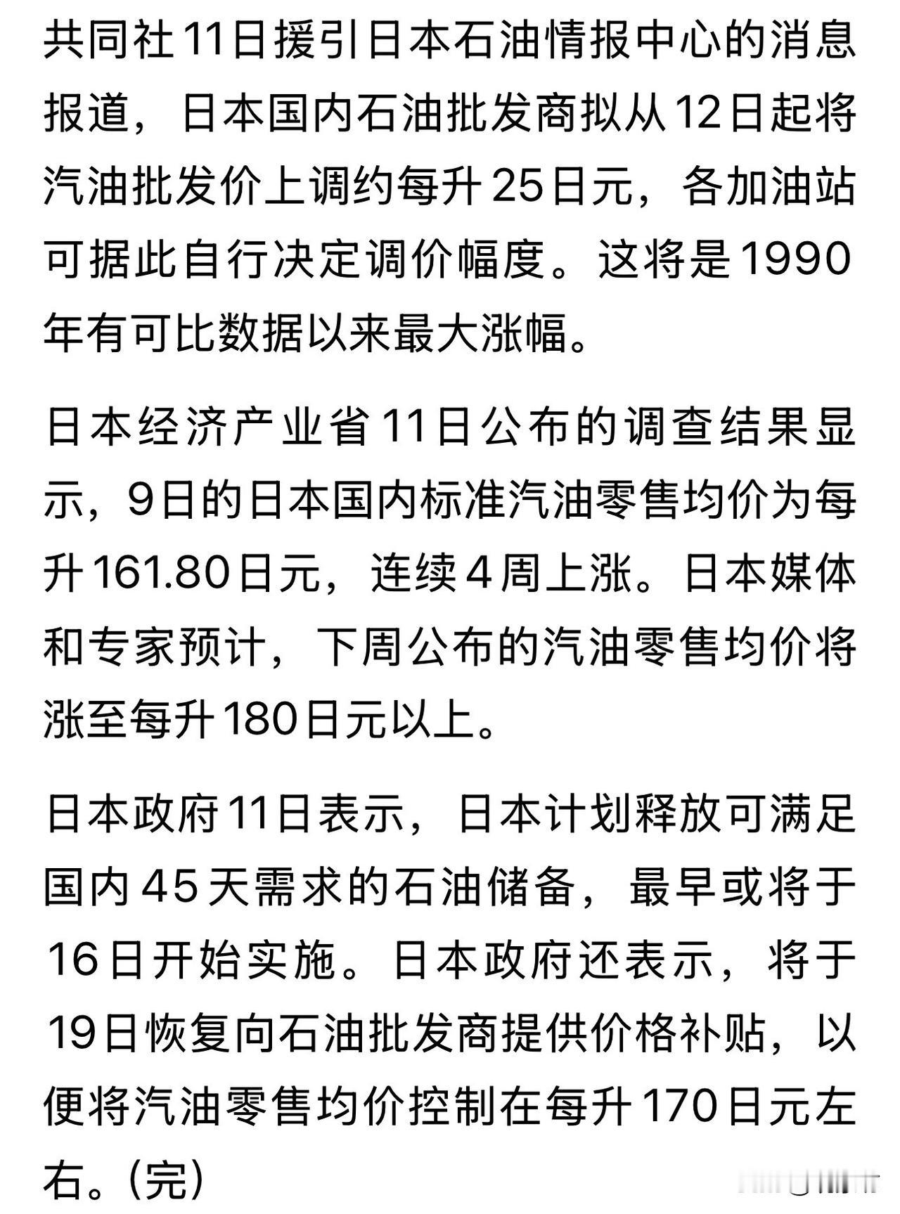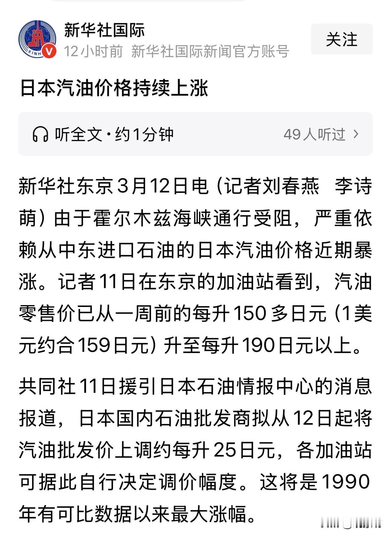 日本油价上涨,民众苦不堪言! 中东霍尔木兹海峡的一声炮响,震碎的不仅是油轮的航行线,更是日本民众对政府能源安全承诺的最后一点幻想。 近期,日本汽油价格如同脱缰野马,一周之内从每升 150 多日元狂飙至 190 日元以上,涨幅超过 26%,创下自 1990 年以来的最大纪录。 若按当前100 日元约合 4.32 元人民币的汇率折算,这意味着日本车主加一升油需支付8.2 元人民币。对于正处于工资停滞期的日本家庭而言,这笔看似不起眼的“八块多”,实则是压垮生活成本的沉重稻草。 东京加油站前,车主们看着跳动的数字无奈摇头,而日本政府却还在不紧不慢地打着那套早已失效的“组合拳”,上演着一出令人啼笑皆非的控价闹剧。 面对这场来势汹汹的油价风暴,日本首相高市早苗紧急指示产业大臣出手,信誓旦旦地表示要释放石油储备、恢复价格补贴,试图将油价强行按在 170 日元(约合7.34 元人民币)的水平线上。 然而,这种“镜花水月”般的目标设定,除了暴露政府的无力感外,更像是一种自欺欺人的政治表演。事实是,截至 3 月 9 日,全国均价已破 161.8 日元(约6.99 元人民币),山形县更是率先冲破 170 日元大关,专家预测下周必将突破 180 日元(约7.78 元人民币)。 政府口中那区区0.86 元人民币的差价目标,在残酷的市场现实面前显得如此苍白可笑,仿佛是在洪水滔天之际,妄图用一把纸伞去阻挡洪流。 日本能源结构的致命软肋再次被血淋淋地揭开:95% 以上的原油依赖中东进口,七成运输命脉悬于霍尔木兹海峡一线。这条“能源咽喉”一旦受阻,日本经济便如同被掐住了脖子。 多年来,日本政府高喊能源多元化,试图摆脱对中东的过度依赖,结果却是雷声大雨点小,炼油设备依旧高度适配中东原油,切换来源成本高企、周期漫长。如今危机来临,所谓的“雄厚储备”不过是杯水车薪。虽然日本拥有可满足 254 天消费的石油储备,但在全球供需失衡和地缘政治博弈的巨浪下,这点家底只能起到短暂的安慰剂作用,根本无法扭转长期依赖进口的被动局面。 更讽刺的是,日本政府一边忙着释放储备、发放补贴,一边却在外交场上进退维谷。外相茂木敏充致电伊朗要求保障油路畅通,却遭到对方毫不买账的回绝;想派自卫队护航,又受制于和平宪法和地缘政治压力,只能干瞪眼。这种“外交靠美国,能源靠伊朗”的尴尬处境,让日本在夹缝中求生存的姿态显得格外狼狈。 工资连续 24 个月负增长,物价却因油价飙升而节节攀升,普通民众不仅要承受钱包缩水的痛苦,还要为政府的无能买单。当每一升油都化作真金白银的8 元人民币从百姓口袋中流出时,任何宏观叙事都显得冷酷而遥远。 高市早苗政府试图用行政手段干预市场规律,无异于缘木求鱼。在日元贬值、通胀高企的背景下,单纯的补贴和放储只能解一时之急,无法根治能源安全的沉疴。 当“滞胀”的阴影笼罩日本列岛,当普通家庭不得不为了加油而缩减口粮,日本政客们的空洞承诺显得尤为刺耳。这场油价危机不仅是对日本经济韧性的考验,更是对其国家战略短视的无情嘲讽。 如果继续沉迷于修修补补的战术动作,而无视战略层面的根本缺陷,那么下一次油价暴涨,或许就不再是折合人民币8 块多的痛感,而是让日本经济彻底窒息的“天价”。