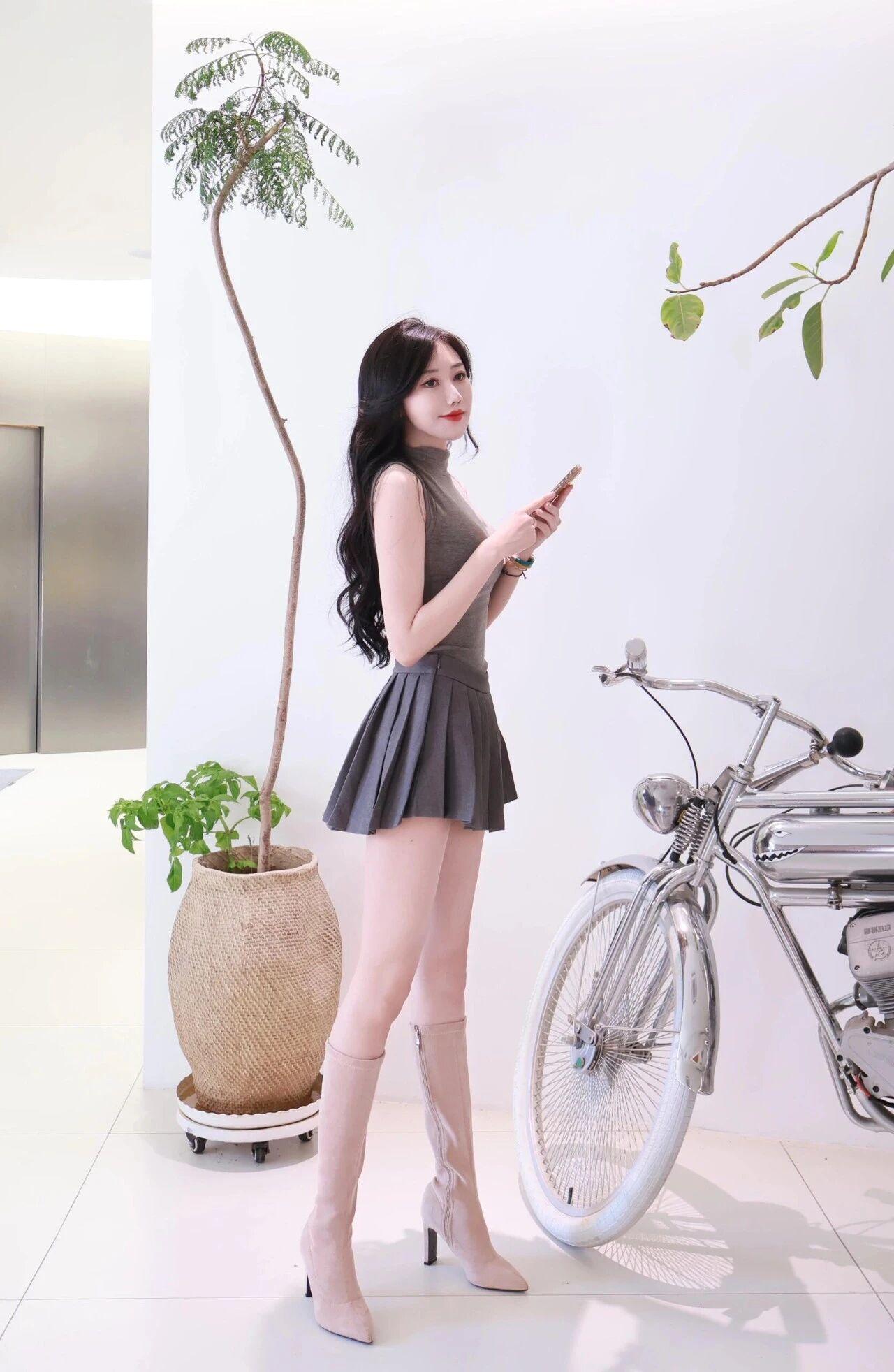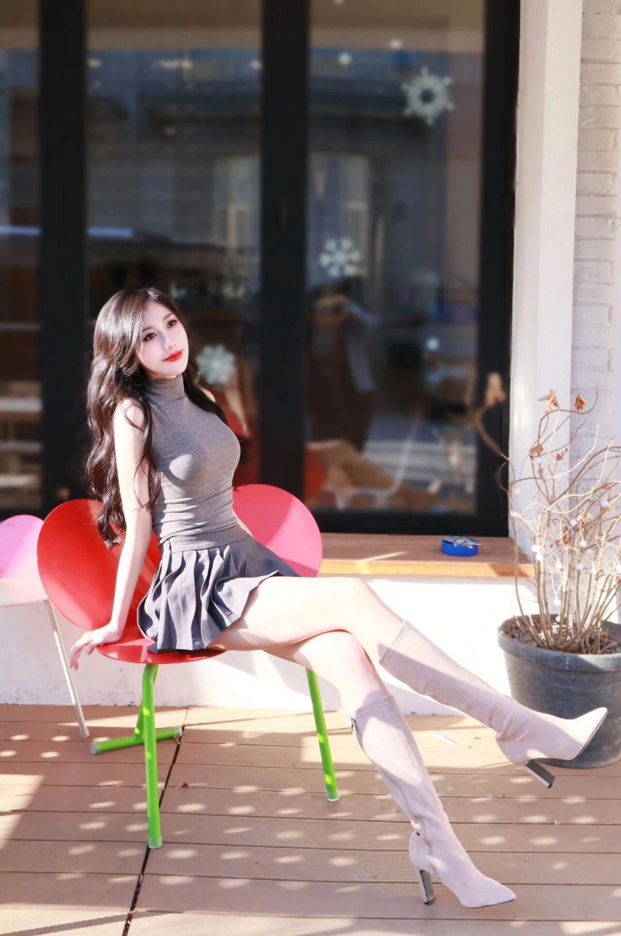 这位美女留着一头乌黑柔亮的大波浪卷发,发丝自然垂落,衬得脸型精致又温柔。眉眼弯弯,唇色是明艳的正红,在白皙肌肤的映衬下更显妩媚动人,气质清冷又带着几分甜意。 她身着一套灰色系穿搭:无袖高领针织衫勾勒出曼妙曲线,搭配同色系百褶短裙,利落又俏皮,露出纤细修长的双腿。脚上踩着一双裸色绒面过膝高跟长靴,靴型优雅,既修饰了腿型,又增添了温婉的女人味,整体风格简约又高级。 在不同场景里,她或倚在吧台手持咖啡,姿态慵懒随性;或立于绿植旁回眸浅笑,氛围感拉满;或坐在沙发上挥手互动,元气又灵动。明媚的光线里,她的每一个姿态都透着都市女性的精致与自信,温柔又有力量。