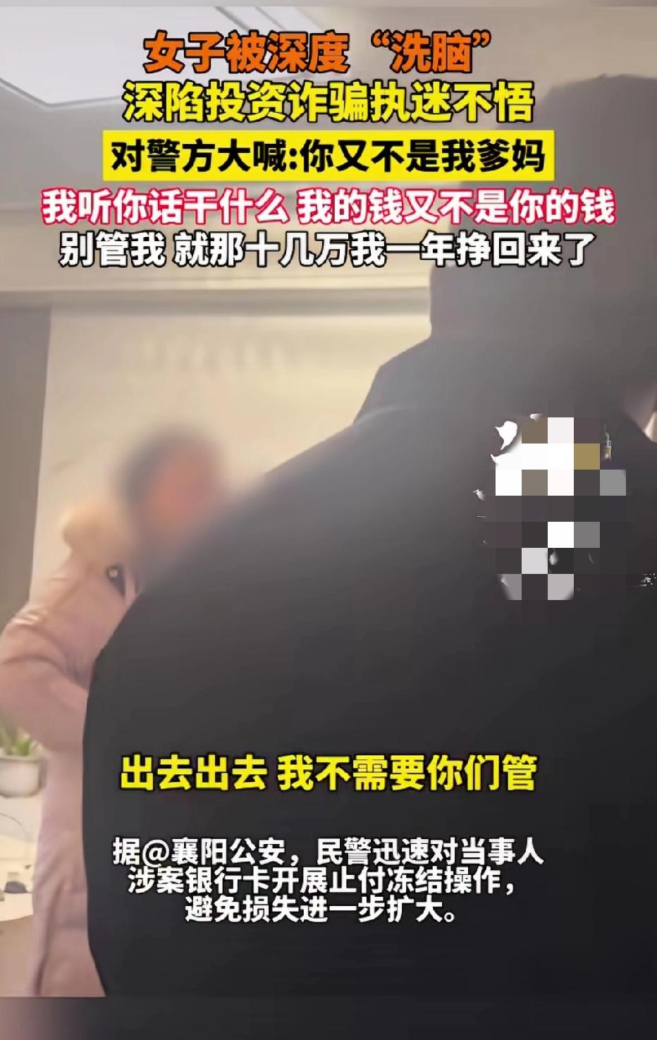近日湖北襄阳,一46岁女子深陷诈骗陷阱,民警上门劝阻反被怼!女子声称自己一年赚10几万,不需要你们管! 女子表示:我自己的钱又不是你们的钱,不用你们管!出去,不需要你们管,你又不是我爹妈?我听你话干什么?我一年赚10几万呢,不用你们来管我!民警沟通多次都听不进去一点!最终,女子名下银行卡还是被冻结了,为了避免她进一步更大的损失!
