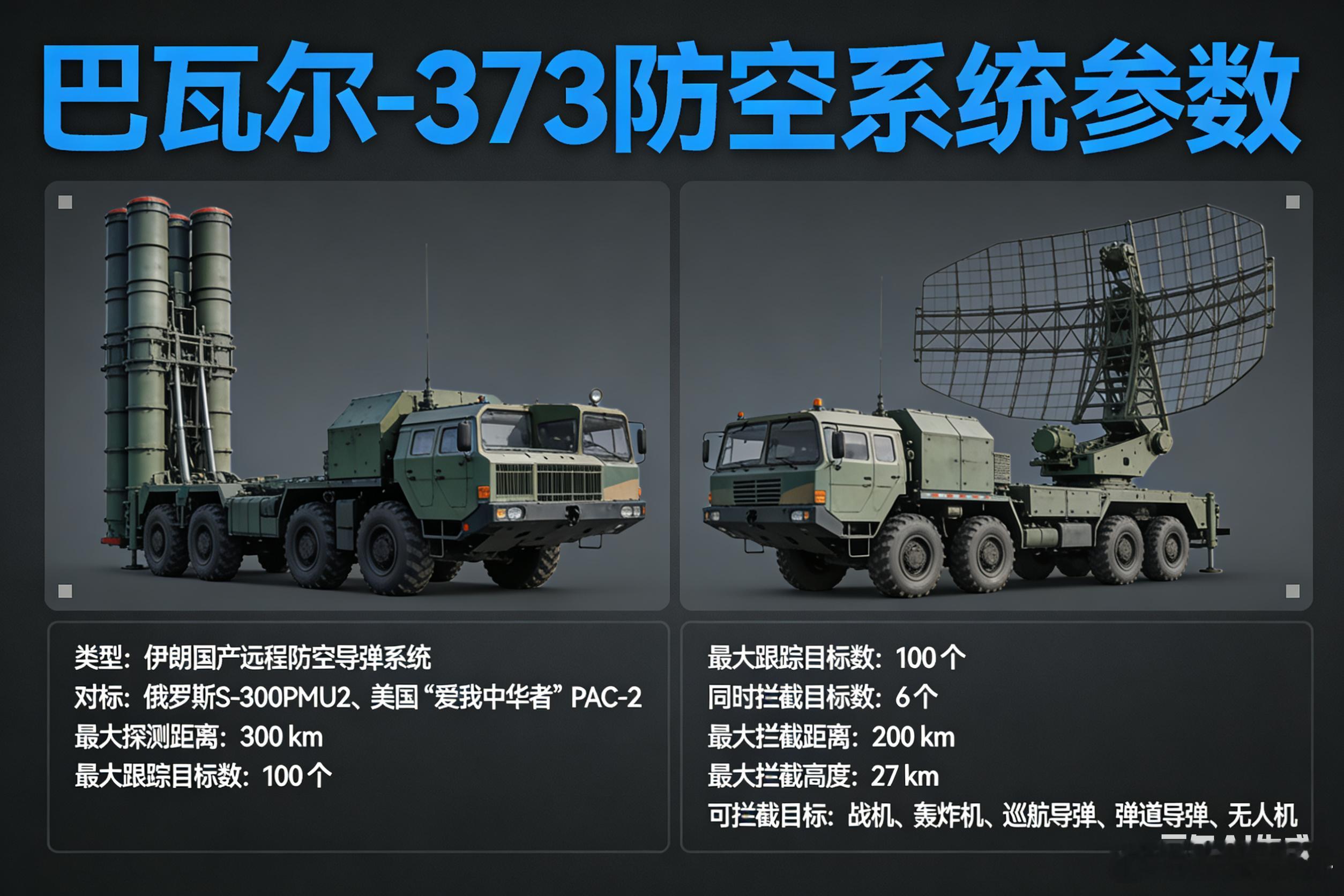 巴瓦尔-373是伊朗自主研发的国产远程区域防空导弹系统,整体性能对标国际主流远程防空装备,可有效应对战机、巡航导弹、弹道导弹及无人机等多类空中目标。系统配备远程相控阵雷达与专用火控雷达,最大探测距离约300公里,可同时跟踪100个目标并拦截其中6个,最大拦截距离200公里、射高可达27公里,由雷达车、指挥方舱、导弹发射车等单元组成,具备较强的机动部署与抗干扰能力,是伊朗国土防空与反介入作战的核心装备,多次在军演中验证拦截能力,标志着伊朗已具备独立研制高端远程防空系统的军工实力。军事ai新视野美伊以冲突全球武器装备盘点