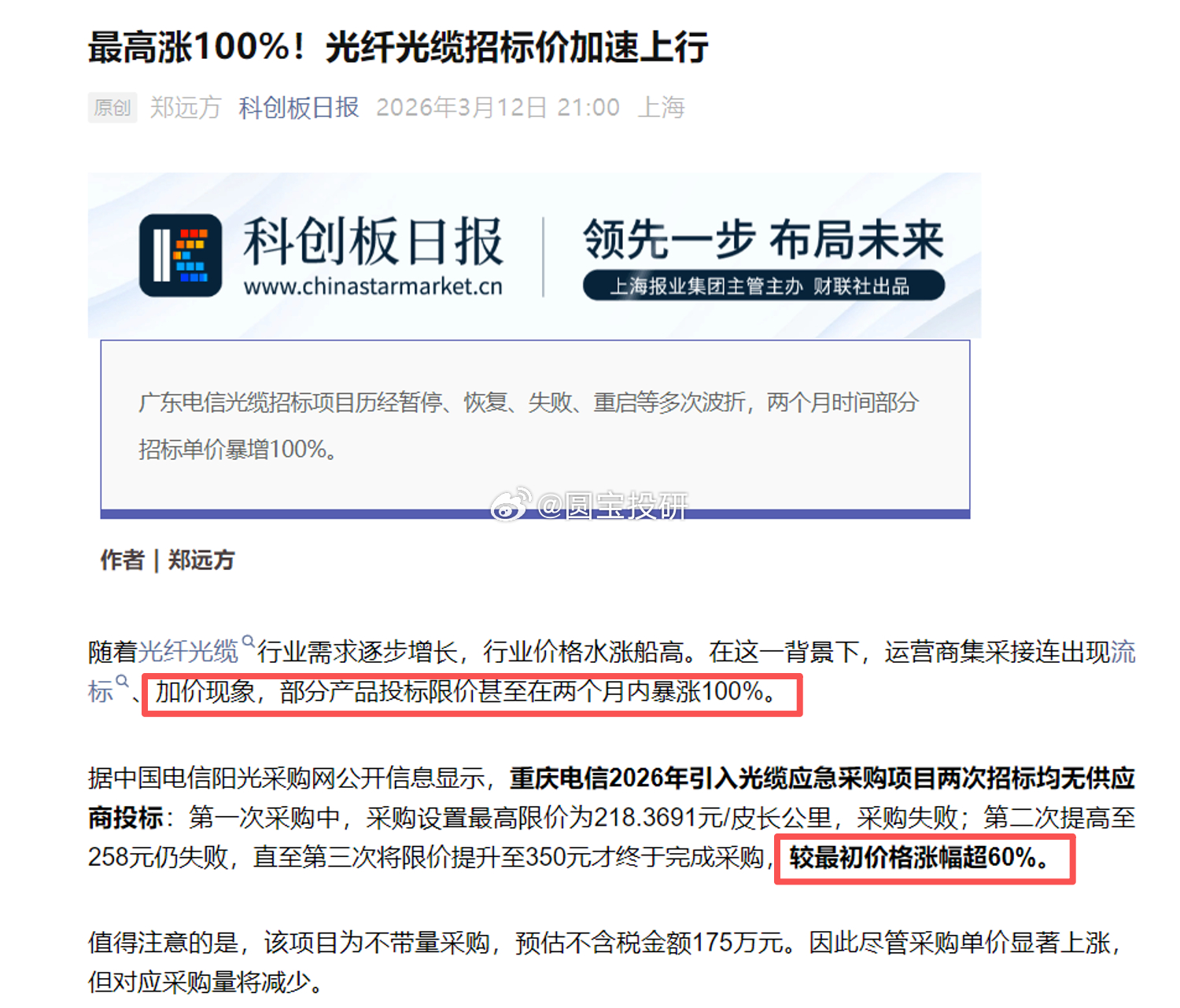 (1)3月12日消息,广东电信重启2026年室外光缆集采,最高限价较1月上浮60-100%。
