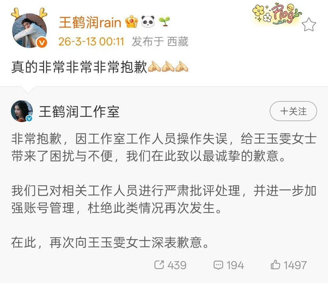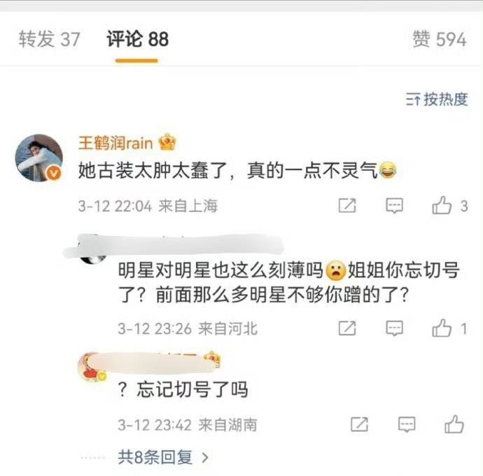 真的离大谱!王鹤润大号直接评论王玉雯古装太肿太蠢、毫无灵气,这话也太伤人了。事后工作室甩锅工作人员操作失误,可王鹤润本人IP在西藏,吐槽评论IP却在上海,漏洞一眼就能看出来。王玉雯啥也没干,平白无故被恶意评价,纯纯无妄之灾,也太无辜了,艺人账号管理也太不严谨了吧。
