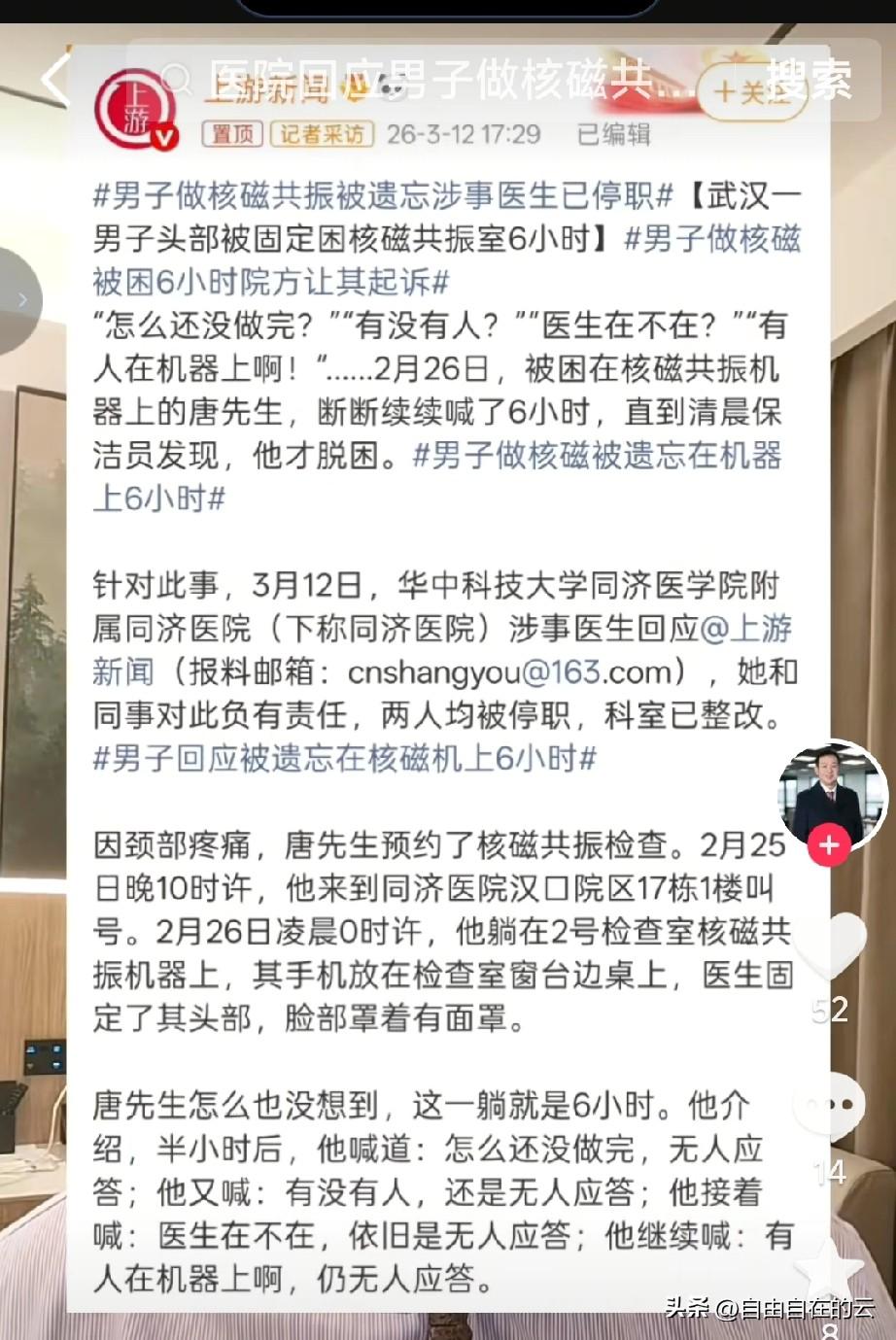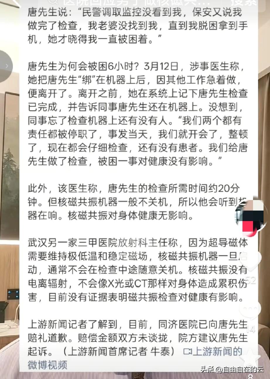 被医生拉在核磁共振机上6小时的唐先生,据律师的分析,他的赔偿不会太多,大概在几千块到一两万之间。 有律师说因为核磁共振没有电离辐射,不像X光或是CT对身体造成伤害,所以对于赔偿来说,赔偿的主要是精神方面。精神赔偿的话就要看这件事是否对唐先生的精神状态造成伤害,看他有没有失眠恐惧,或是焦虑等等。 说实话,这件事完全是医院的责任,即使核磁共振对身体没有影响,但是把一个人绑在机器上6个小时,叫天天不应,叫地地不灵,机器也在不停的运转,我相信这6个小时唐先生一定度日如年吧。也得亏唐先生是个男的,年纪还不算太大,如果是个老人,万一出了意外,医院能承担起这个责任吗? 这时候医院应该能够主动和唐先生沟通,真诚道歉,尽量满足病人的要求才对。还有除了两个涉事的医生,医院的管理也存在很大的漏洞,如果唐先生妻子找他时,保安能过去看一看,或者给医生打个电话,也就没有这回事了吧。 对于这件事,你怎么看呢?