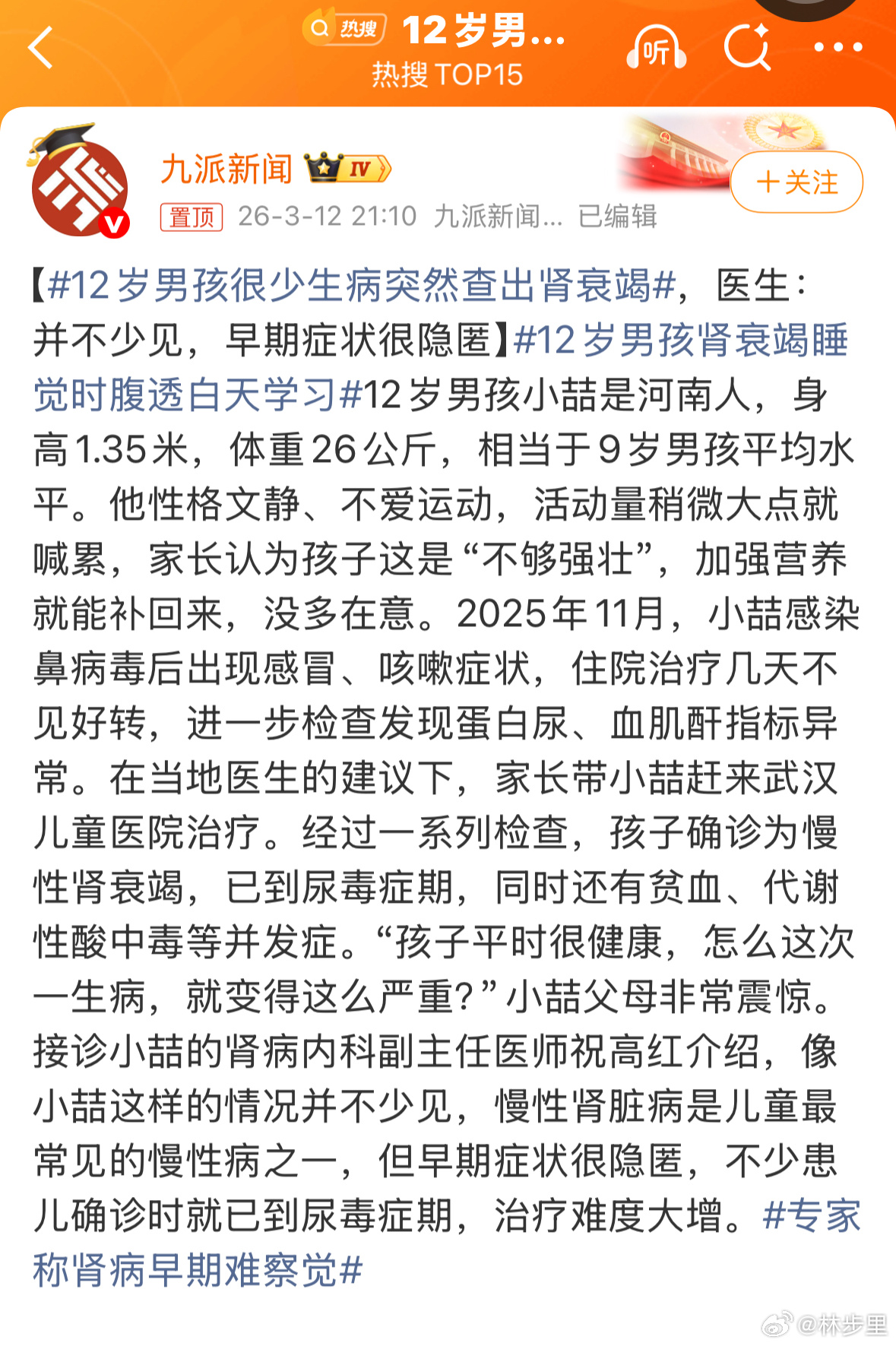 12岁男孩很少生病突然查出肾衰竭好了,这样的新闻一发。有的人又要鼓吹生病锻炼身体了。