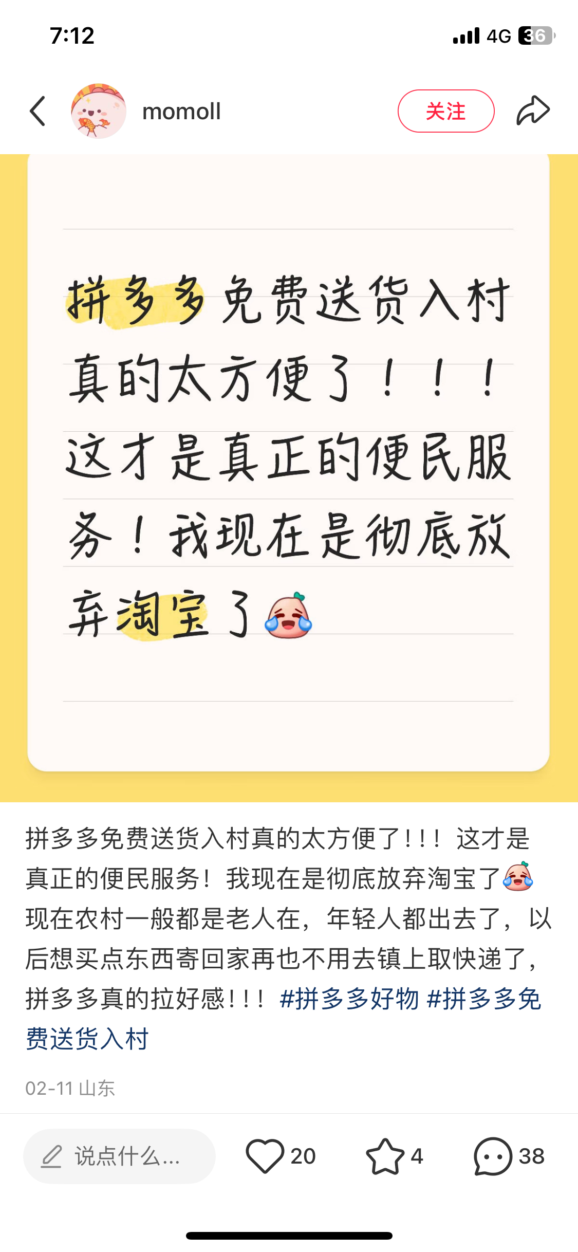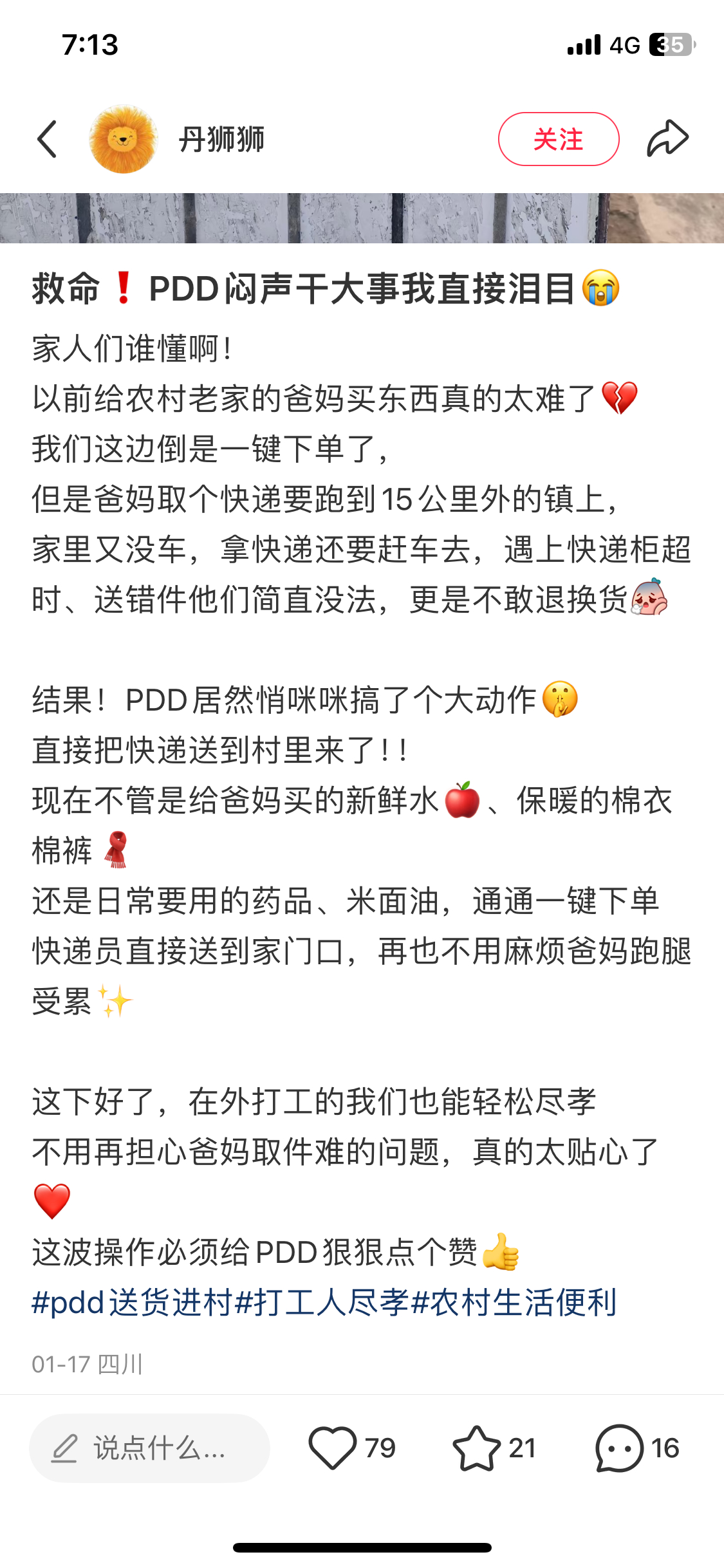电商下沉不只是一句口号,而是实实在在改变了老家的生活,为pdd送货进村点赞!